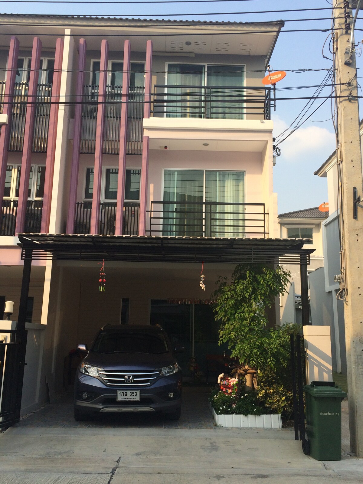 Our new modern 3-story family townhome is in the housing project named “the Plant Citi” located in Muang Thong Thani, which is the area of the famous exhibition center in Bangkok. It is only 5-minute walk to Impact Forum and Impact Exhibition Center, 15-minute walk to Cosmo Bazaar Shopping Mall, 15-minute drive to Don Muang Airport and 5-minute walk to a sky train. Taking a car or taxi from the next corner of our house via Srirat Expressway is the easiest way to get to Bangkok CBD.