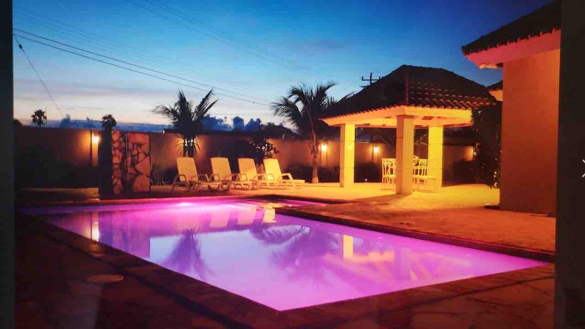 Charming 3-Bedroom Retreat with Private Pool – 5 -7 Min Walk to Beach! Welcome to your perfect Aruba escape! This beautiful 3-bedroom, 2-bath vacation home features a private, lighted swimming pool and beautiful backyard garden . It is 5-7 minute walk from world-famous Palm Beach -known for its crystal-clear turquoise waters and soft white coral sand. Restaurants , malls, beaches & casinos are at walking distance .It is perfect for families or groups looking to relax in comfort and style.
