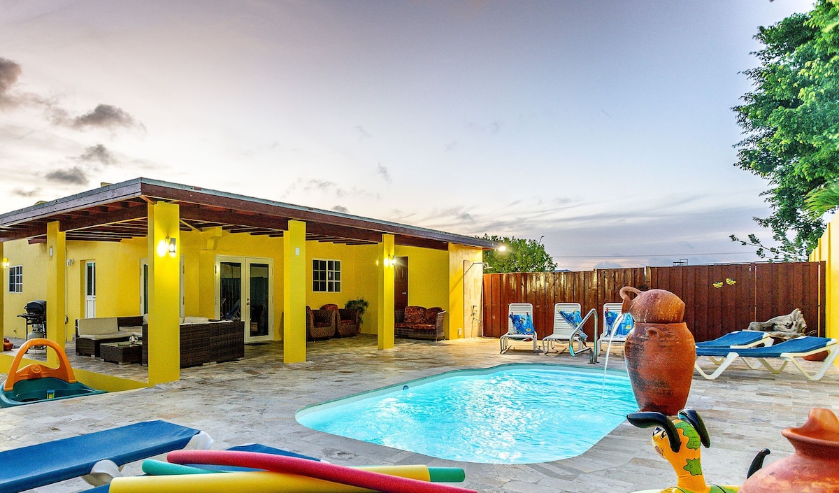 Experience Aruba from the comfort of this modern, comfortable home with a 5-minute walk to some of the world's greatest beaches. The house is in a very quiet neighborhood with a PRIVATE backyard. Enjoy your own sky-blue pool, bar-b-que, tiki bar, and sitting areas. An excellent choice for families who want to live like the island locals and enjoy nearby restaurants, night clubs, resorts, malls, and beaches.