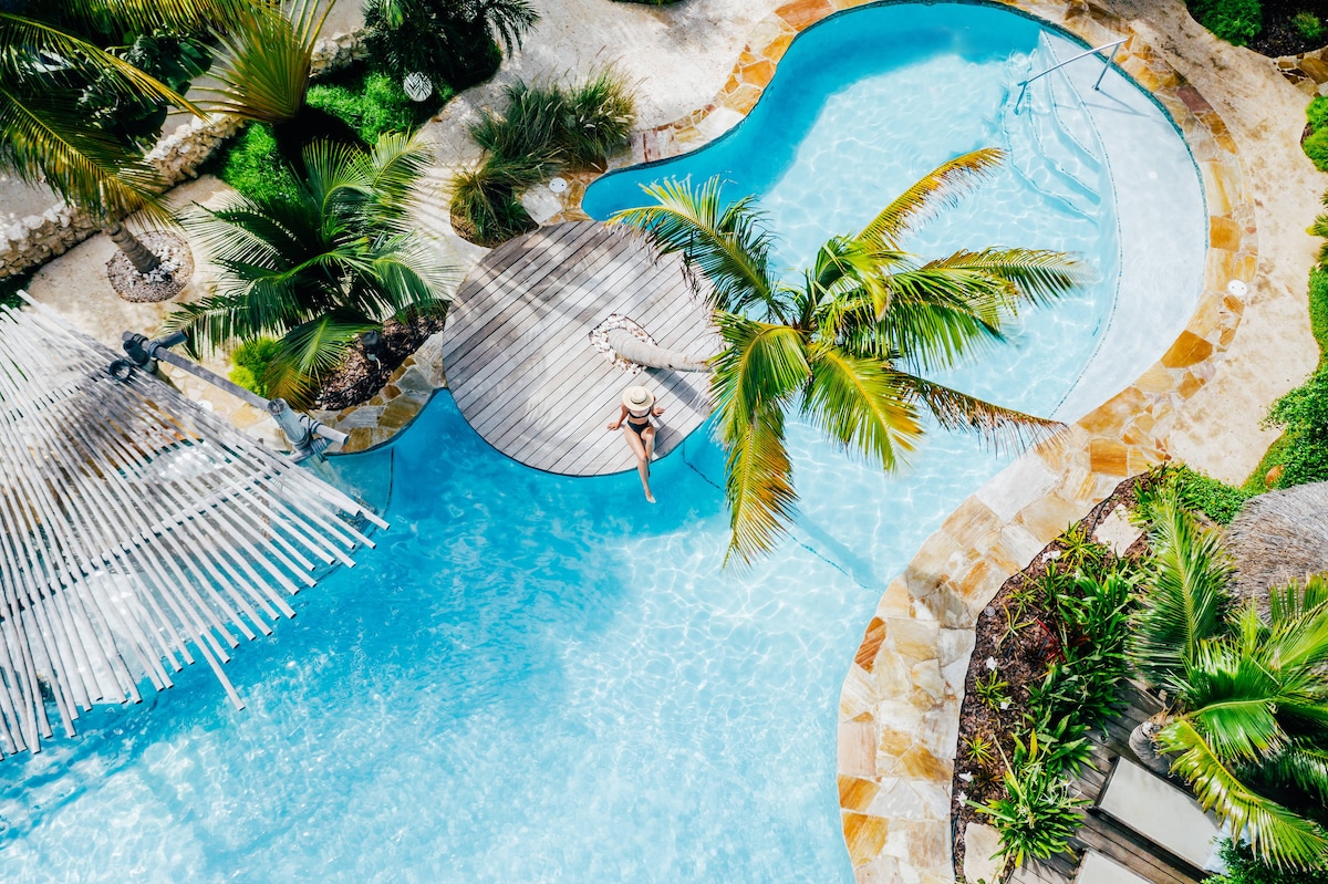 Our spacious Two Bedroom Casita at Boardwalk Boutique Hotel features two bedrooms, two bathrooms, a full kitchen, and a large patio with BBQ and hammock. Boardwalk is an award-winning boutique hotel celebrating barefoot luxury with two pools, an onsite restaurant and bar, plus a dedicated beach area on Palm Beach with shade and comfortable beach beds.
