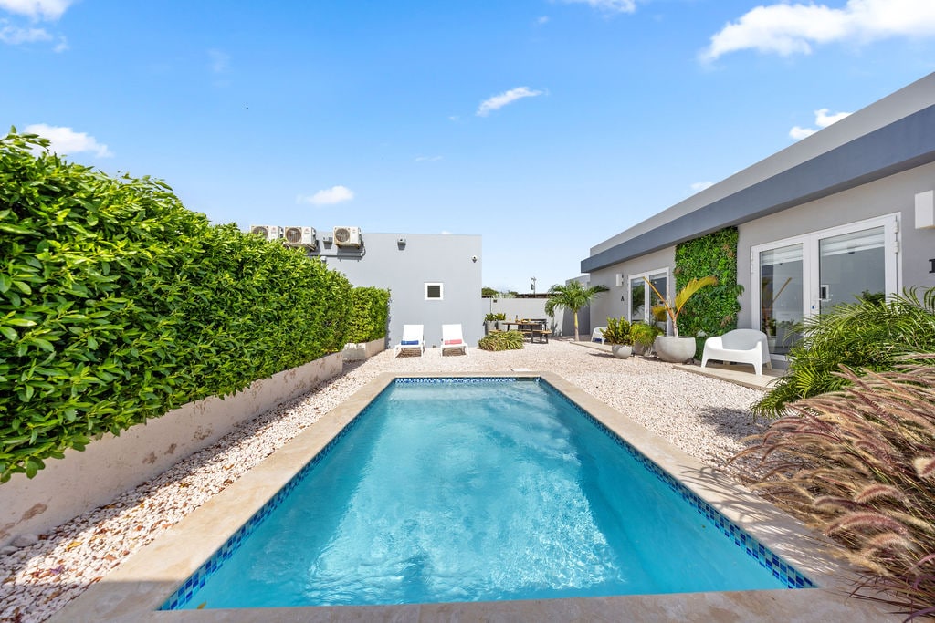 This is a very Cozy, Clean, and Modern place. There is a hot shower. We have a large gazebo with dining table and a grill. It’s located in the middle of the island area Paradera. 7 Minutes from the airport 10 Minutes from Downtown and 12 Minutes from the high rise. There are small supermarkets nearby. We have the option to rent a car with free airport pick up. The place has a beautiful salt water pool with a waterfall that will be cleaned professional twice a week.