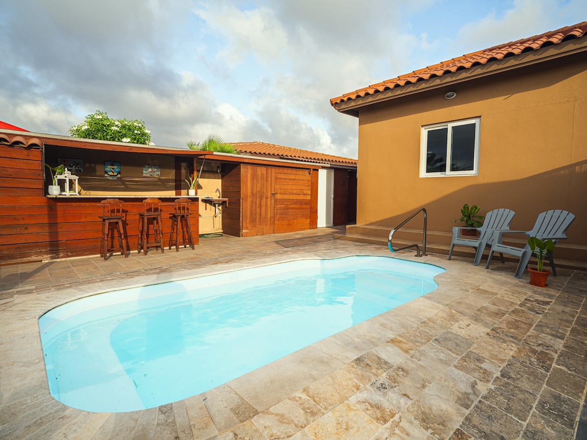 带厨房和游泳池的温馨家庭小屋