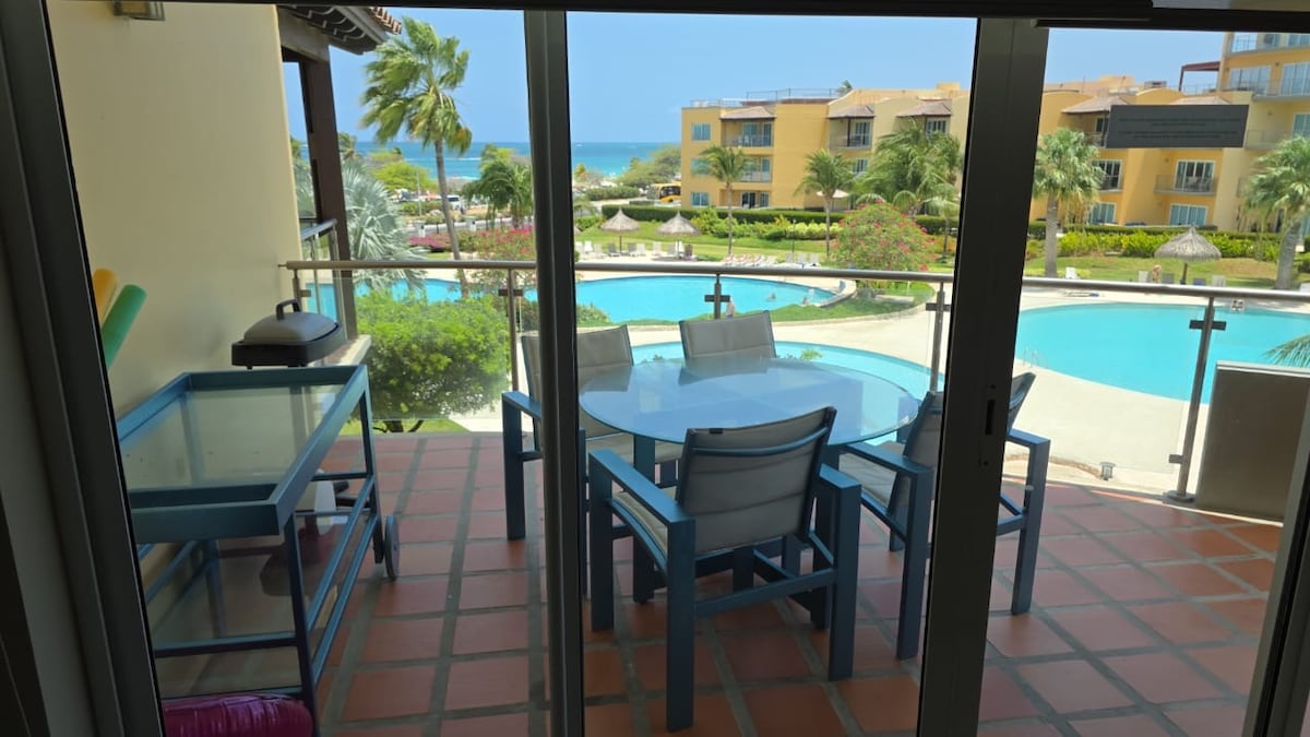 .Wake up to Eagle Beach views from your private terrace – perfect for couples or families.. POOL and GYM. The Premium two bedroom condo is modern furnished. This condo has a master bedroom with a king size bed, a walk in closet and a full modern bathroom; a second bedroom with two attachable full beds , built in closet and another full bathroom; a living room with a full sofa set; a full sized fully equipped modern kitchen. wash and dryer machine and a regular balcony stretching
