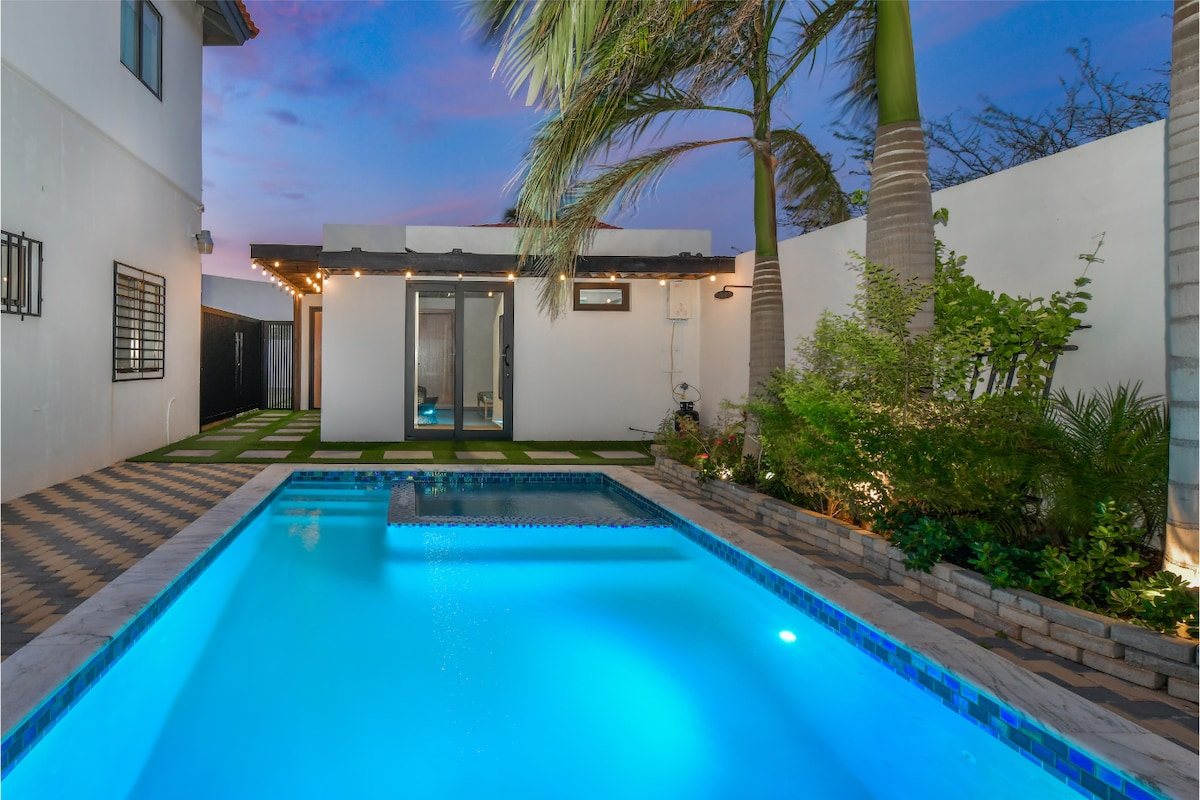 Welcome to Casa Carmela. Relax in the resort sized pool and outdoor oasis. Melt the day away under the exotic palapas or toast your buns in the sun. Whatever your pleasure, Casa Carmella aims to please. She’s a short walk to Palm Beach one of the top rated beaches in the world. Restaurants, casinos and nightlife are walkable as well. She comes with a comfy king size bed, gas grill, fully equipped kitchen, beach chairs & beach towels and cooler. This is all yours and only yours.