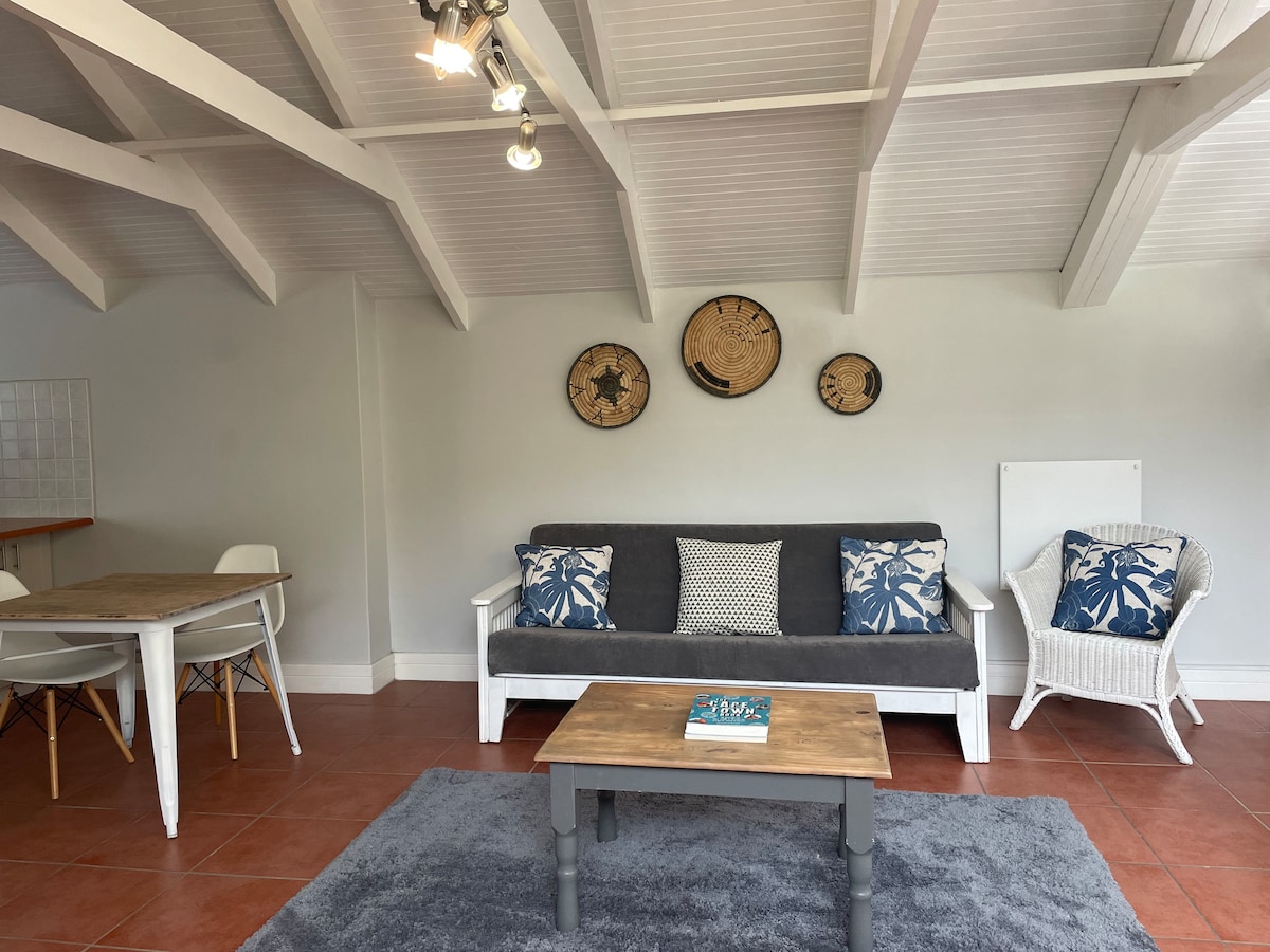 Unwind on the poolside loungers after a busy day exploring and enjoy the view of Table Mountain. This spacious modern studio looks out onto your own exclusive use luxurious private pool patio. Go for a morning stroll along the beach, just 100 meters away. Use the study desk area indoors, or the large poolside table outside on the sheltered patio to work remotely with our high speed Fiber. The studio has backup lighting, air conditioning, Netflix and your own gated parking bay.