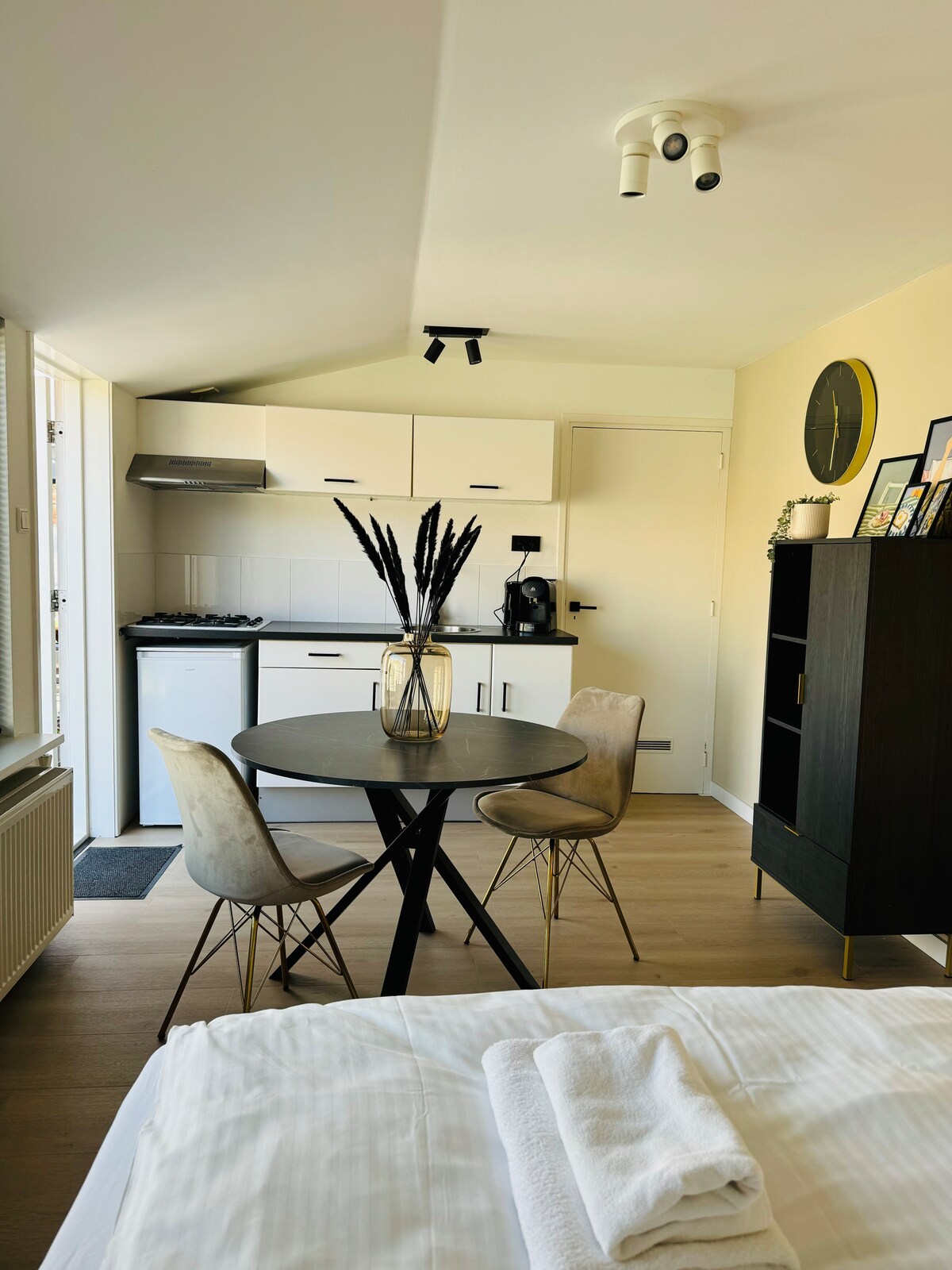 The studio (23m2) is located right in front of the beach and next to the dunes. Relax and hide away in this luxurious, small studio. It will comfortably fits 2 and is completely new, finished in June 2021. Stylish living space with smart TV, fully equipped kitchen, comfortable king size bed, perfect WIFI and bathroom with separate toilet. You have a small private patio with dining table and chairs. 1 dog is very welcome. This is the perfect ocean studio for your beach holiday. No free parking.