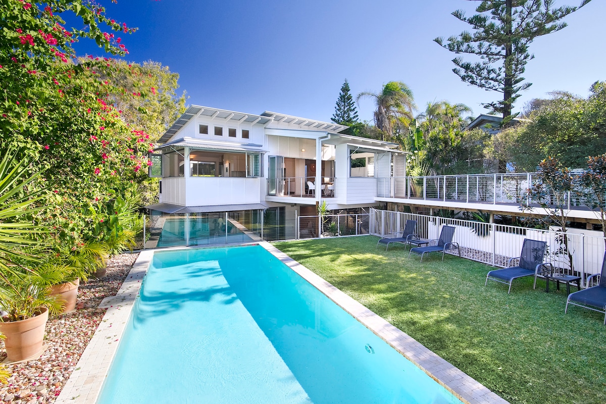 Seachange is situated in a quiet Sunshine Beach cul-de-sac opposite the Noosa National Park, a short distance (10-minute walk / 3-minute drive) to the beach, shops, bars and restaurants and is a 10-minute drive to Noosa. Seachange has four double bedrooms so is Ideal for families and groups. There is also a large study / fifth bedroom with workstation. Facilities include a pool, with large deck and outdoor eating area (with BBQ), TV, Wi-Fi, full kitchen, laundry, & ducted air-conditioning.