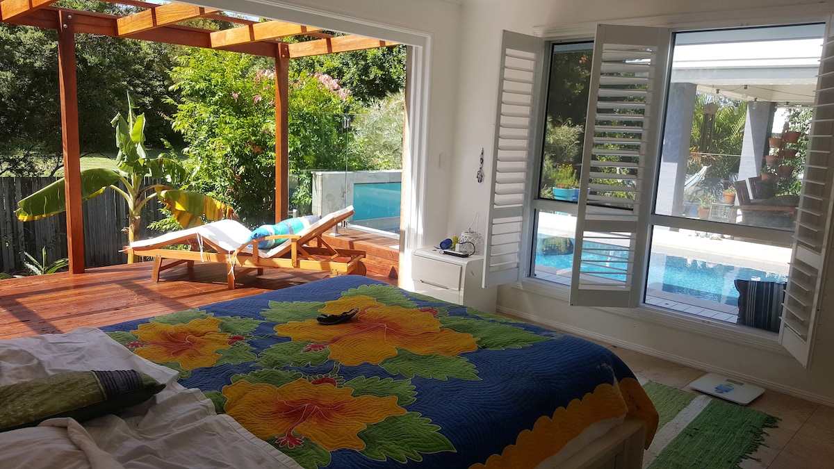 Our air conditioned, pet friendly unit is a private separate space with your own entrance, lounge room, bedroom with ensuite and garden and outdoor BBQ dining area. We are near Lake Weyba which has lovely walking tracks .There is a walking trail through the National Park to Peregian Beach (3kms). A rare find to be on a rural property abundant with Australian wildlife and only a short drive to several patrolled beaches, shops and excellent cafes in an exceptionally dog friendly area!