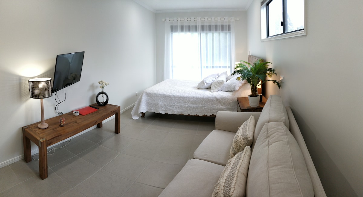 Studio 17 is a separate self contained one bedroom, air-conditioned studio with private entry and off street parking. Located on our premises and just 3-5 minutes to Hastings Street by car (40 minutes if walking) and Noosa Junction dining, the studio is also located within walking distance to Noosa's Farmer's Markets, Noosa River, cafes, restaurants and Aldi for grocery shopping. Your hosts Susan and Mark invite you to stay a while, enjoy the Noosa Lifestyle in complete comfort and security.