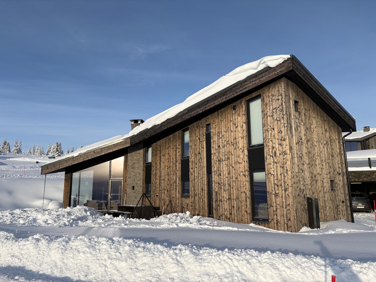 Stor nyoppført hytte med flott plassering øverst i alpinområdet, 100 m til ski-heisen. Langrennsløyper i umiddelbar nærhet. På sommertid har man morgensol på frokostterrasse, før ettermiddagssola strekker seg rundt til stor kombinert terrasse i skifer og tre, med fantastisk utsikt mot Jotunheimen! Flott turterreng hele året. To soverom og to bad i 1. etasje. Hems med to soverom og åpen løsning ned til stue. Stort kjøkken med direkte tilgang til skirom/smørebod. Hytta har elbil-lader.