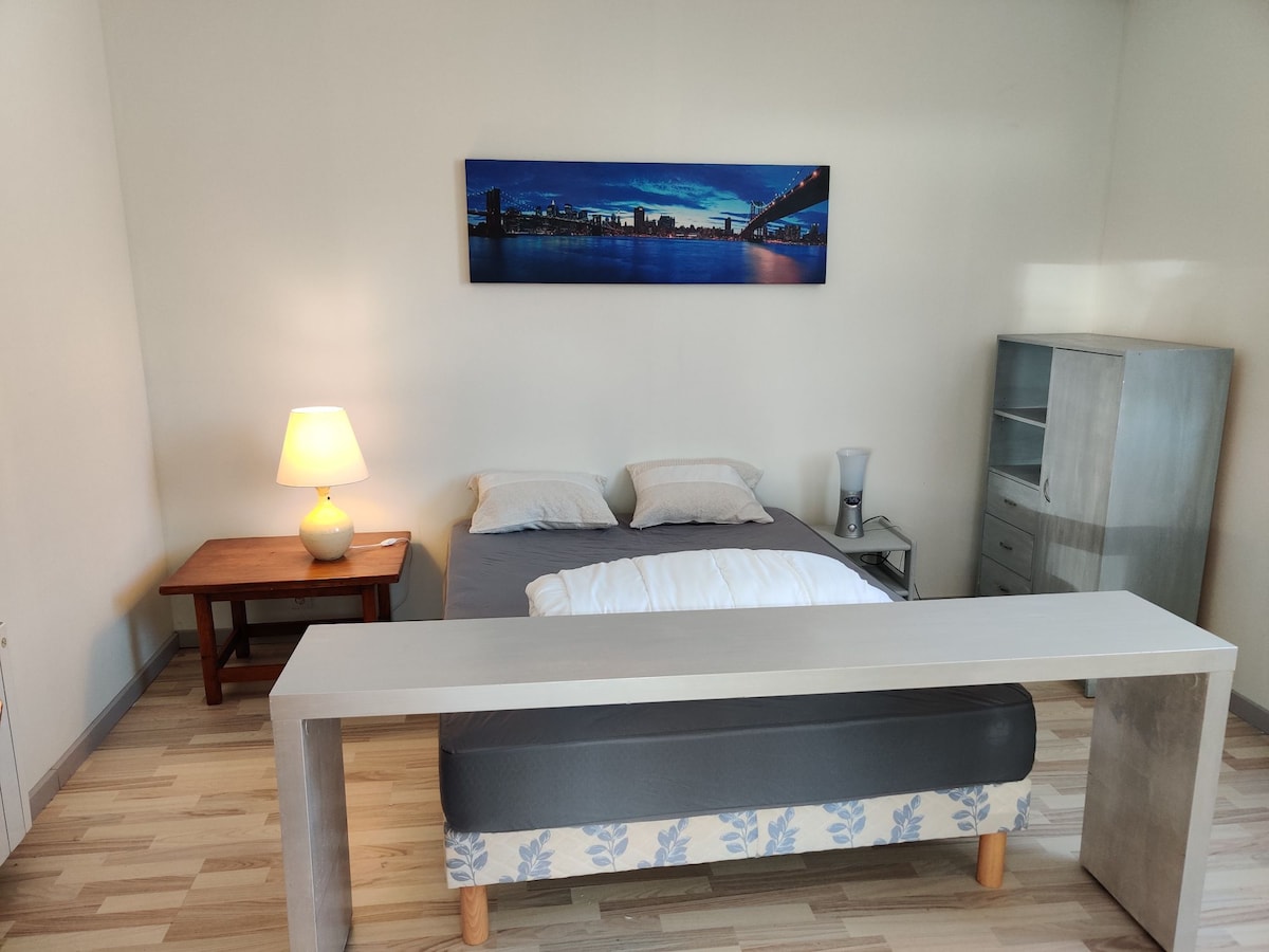Dans une résidence privée studio indépendant refait à neuf . Vous aurez tout le confort que vous avez chez vous . Cuisine entièrement équipée , machine à laver même internet . Vous aurez un pass pour le portail électrique et votre véhicule sera en sécurité dans un parking entièrement clos . Vous serez à quelques minutes du centre et de la gare sncf .