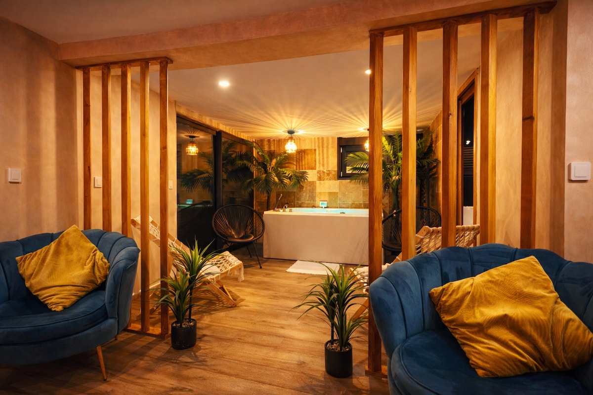Plongez dans l’évasion et la sensualité de notre secret room, un cocon au charme balinais pour une nuit d’amour inoubliable. Profitez d’une baignoire balnéo, d’un sauna relaxant pour des instants de détente, et laissez libre cours à vos désirs avec le fauteuil tantra sublimé par un miroir XXL Riez ensemble autour du baby-foot, puis offrez-vous une nuit douce et voluptueuse dans un lit king-size 2m X 2m aux draps satinés. Calme, exotisme et passion vous attendent Réservez vite ! netflix inclus