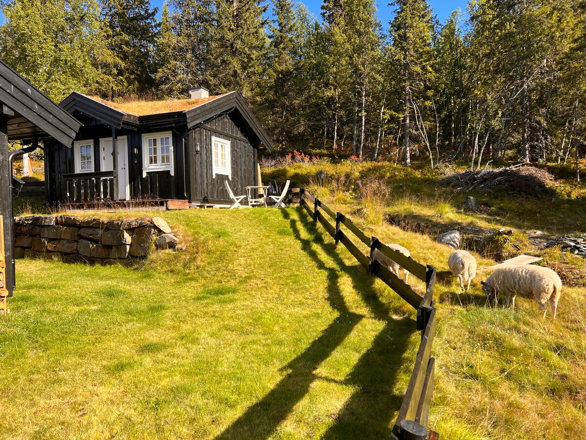 Storhytte på gårdstun i naturskjønn fjellbygd.