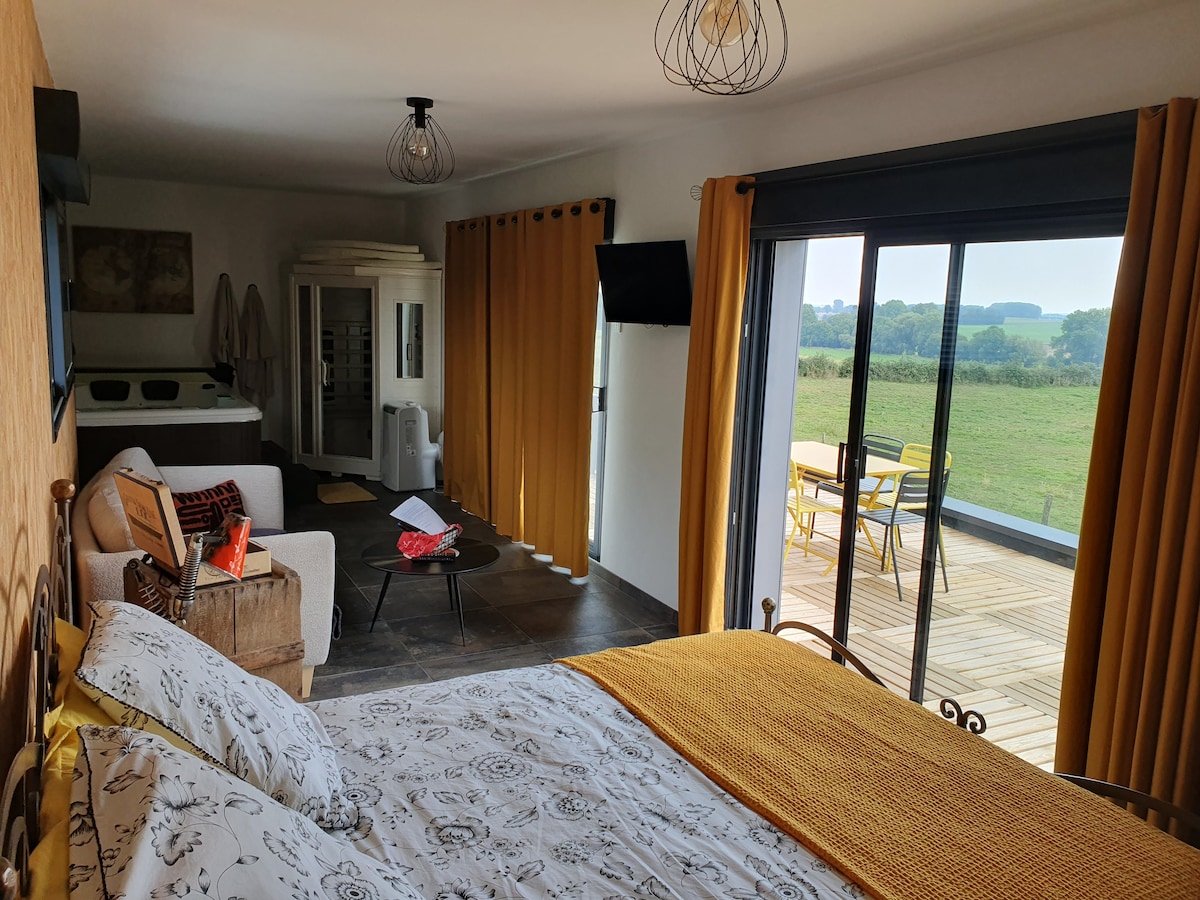Envie d'un séjour romantique et reposant au coeur de la campagne, venez découvrir le pré en bulles ! Un espace ouvert, chaleureux comprenant : chambre, salon, cuisine, salle de bain, wc, SPA et Sauna. Mais aussi une terrasse avec vue sur le village, et la campagne environnante. Possibilité petit déjeuner (18€/2)