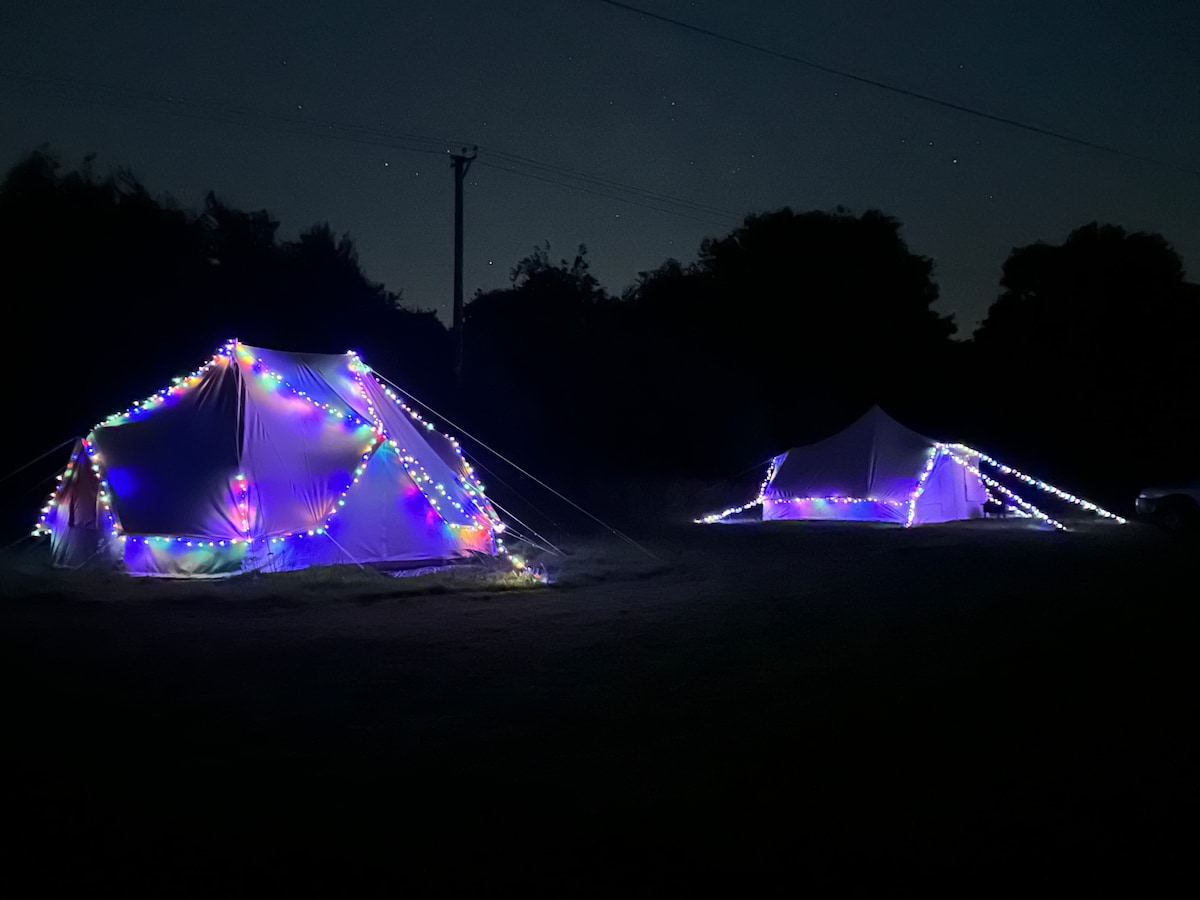 Knusse glamping tent voor 2–3 personen De tent is voorzien van een 2-persoonsbed. Kom je met z’n drieën? Neem dan zelf een extra matje of bedje mee , idyllisch gelegen tussen de velden en het groen. Geniet van rust en romantiek : privé sanitair en een hout gestookte hot tub onder de sterren. Perfect voor een ontspannen uitje in de natuur. Boek nu jouw romantische escape! Alles is VOLLEDIG privé.