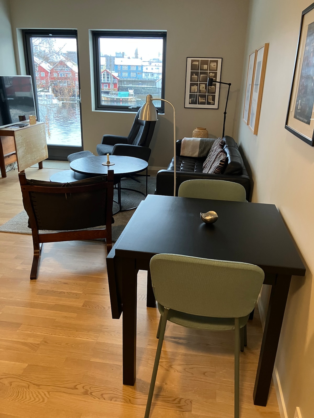 Unik beliggenhet - usjenert hus rett ved Ladestien med fantastisk sjøutsikt. Gulvvarme og helt nytt. 100 meter til busstop og gangavstand til sentrum (35min.) Bedroom is up the ladder (se pictures). Low with sloping ceilings. Window perfect for watching the stars and sometimes the northern light! The other doublebed is behind the sofa and can be pulled up/down.