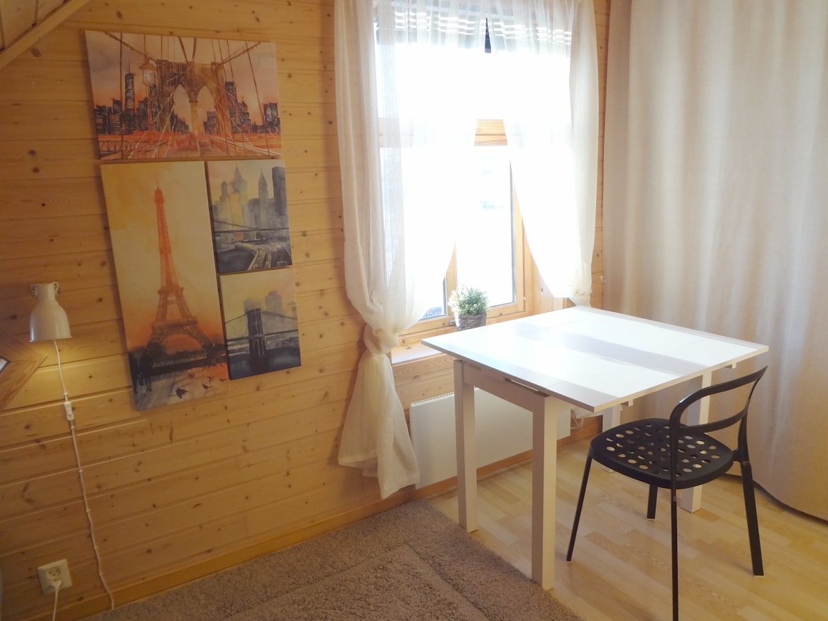 (See the MAP in the pictures for the exact location) 2 rooms with kitchen/bathroom in loft apartment (3rd fl.) Cozy kitchen with everything you need, including dishwashing machine. -------------- (Se kart i bildene for eksakt lokalitet). 2 roms med kjøkken&bad i loftsleilighet (3. etg.) Koselig kjøkken med alt du trenger inkl oppvaskmaskin.