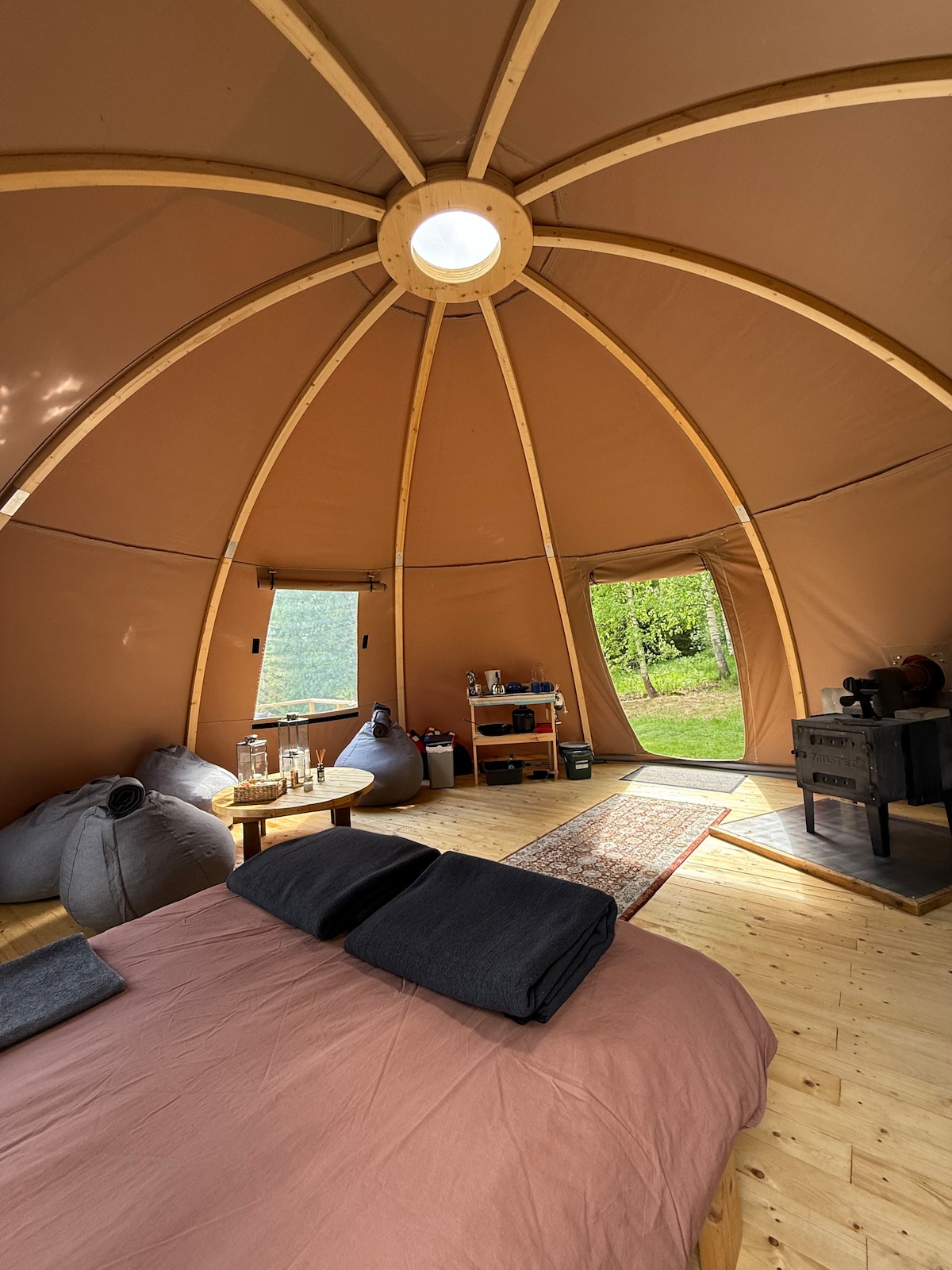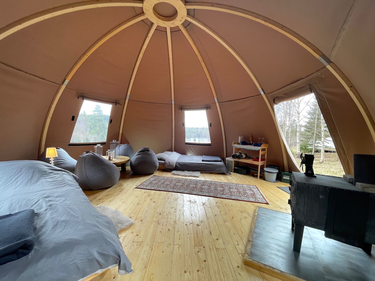 Enjoy happy moments with family and friends in the heart of nature. The wigwam is 30 m²- 3 m high - and offers all the space you need for two adults and one to three children. It features two real beds: 140x200 and 120x200, with warm blankets for everyone. The wood stove keeps the space warm in all season. You can cook on the outdoor firepit – we provide pots, pans, cutlery, firewood, and fresh water from our spring. Enjoy free access to the lake, canoes, and sauna sessions – all included.