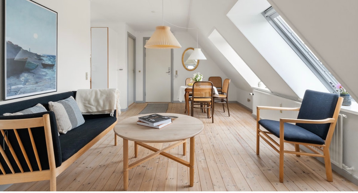 "Velkommen til vores lysfyldte taglejlighed, hvor du kan nyde en fantastisk udsigt over byen fra den rummelige terrasse. Lejligheden er indrettet i moderne skandinavisk stil, hvor du kan lave mad og slappe af. Vi har også sørget for alt, hvad du behøver for et komfortabelt ophold, herunder gratis parkering, internet og et fuldt udstyret køkken. Lejligheden ligger i et roligt kvarter i byens centrum, hvor du kan finde restauranter og butikker. Vi glæder os til at byde dig velkommen!"