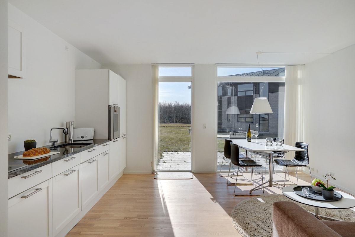 Lystrup Strand Ferieboliger offers this lovely two-story apartment. The apartment has 2 rooms, each with 2 beds. There is a bathroom/toilet on the ground floor along with the bedrooms. The kitchen and living room are on the first floor, serving as a wonderful gathering place for the family. From the holiday apartment, you can enjoy the view of the Kattegat, and it is within walking distance to a very child-friendly beach. There is a large lawn with a trampoline and a play tower with a swing.