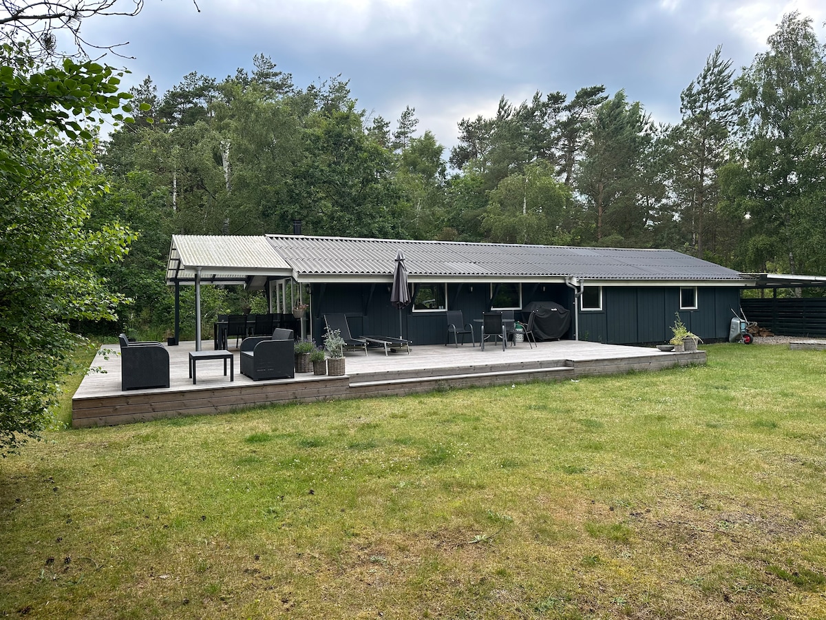Beautiful Scandinavian holiday home in the middle of the forest and close to the water. The holiday home is set on a large natural plot where you can relax on the spacious 140 m² terrace. There are plenty of opportunities to enjoy outdoor living.