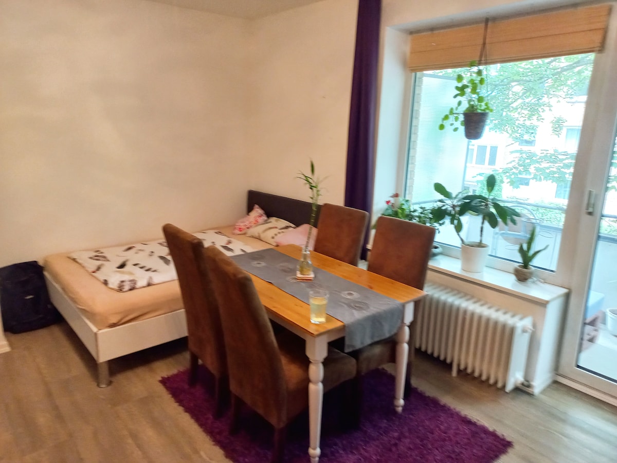 496 / 5.000 We are renting out our small 20 sqm apartment in the basement. It has a large living room with a new double bed (queen size), desk, closet, table and armchair. There is a kitchen and a toilet. The shower is in the side entrance. The apartment has a beautiful large window and is very bright and recently renovated. WiFi is available. We are 30 minutes from Hamburg Town Hall (City), good connections. There are shops as well as a pharmacy and restaurants nearby.