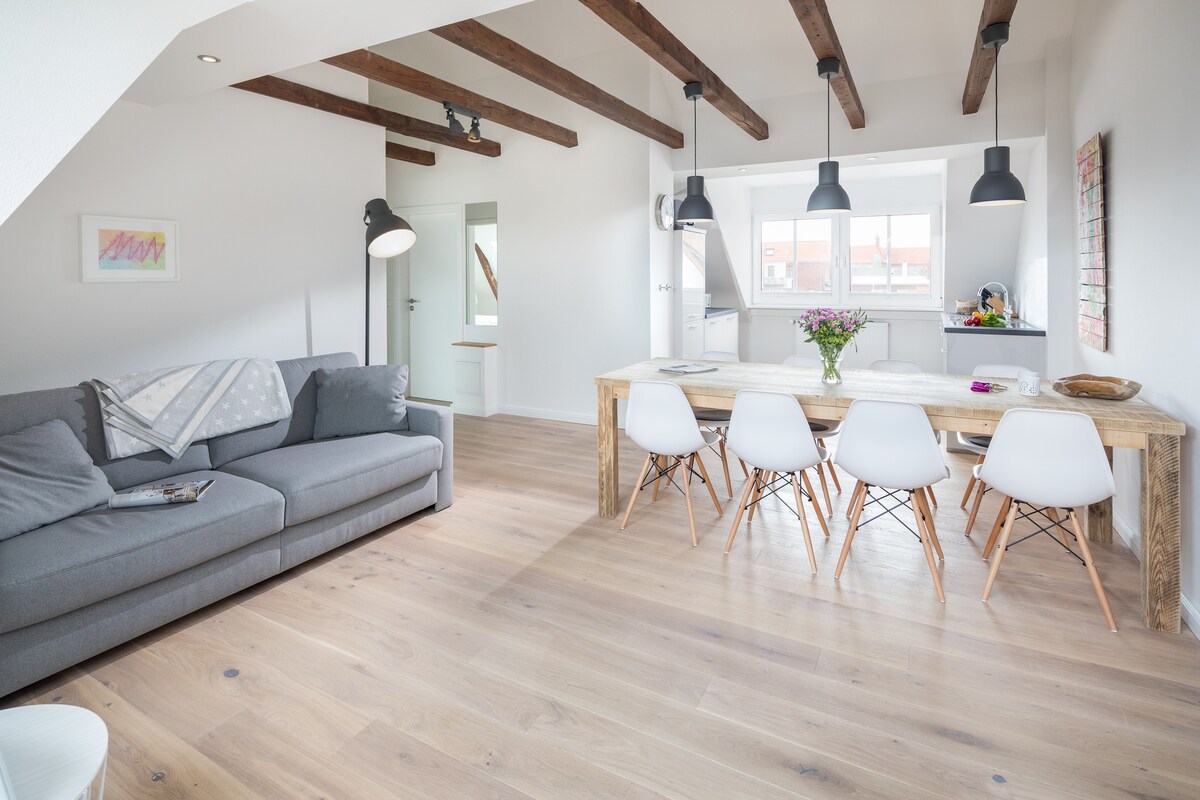 Diese traumhaft schöne Ferienwohnung Loft E im Strandloft 2 umfasst das komplette Dachgeschoss und hat 3 Schlafzimmer und Schlafmöglichkeiten für 6-8 Personen und 2 Bäder Komplettes Dachgeschoß ca. 95 m² Wohnfläche 3 Schlafzimmer mit Doppelbetten Hochwertige Schlafcouch im Wohnraum Schlafmöglichkeiten für 6-8 Personen 2 Badezimmer mit Dusche und WC Offene Küche Wohnzimmer