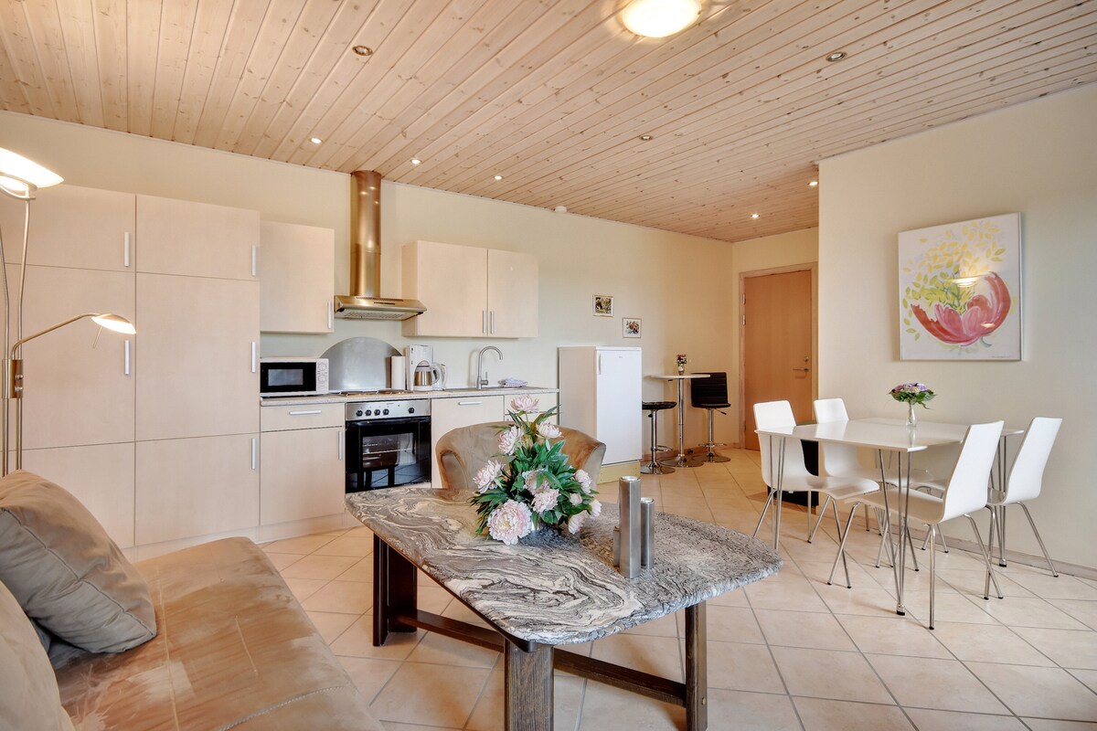 The holiday apartment offers 60 m² of spacious, cozy living. On the ground floor, you’ll find an open living area with a kitchenette including a dishwasher, a dining table for four, a sofa corner with a pull-out bed, and a wood-burning stove. The large bathroom on the ground floor features a toilet, washbasin, walk-in shower, shelving, and heating. The bedroom upstairs is generously sized, with a large wardrobe, two armchairs, a double bed (150 x 200 cm), bedside tables, and wooden flooring.