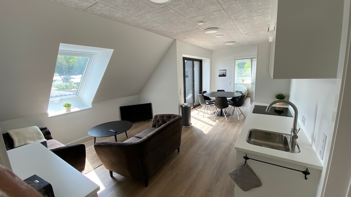 Lejligheden PANORAMA har, som navnet antyder, panoramaudsigt over hele Genner Bugt. Lejligheden er indrettet med et lyst og lækkert køkkenalrum med stor spiseplads. I stuen er der sovesofa og en lille mediesektion TV og B&O anlæg. I soveværelset finder du en lækker dobbeltseng fra European House of Beds. Det helt særlige ved PANORAMA er at du har havudsigt fra alle rum. Der er direkte adgang til en stor tagterrasse og det fælles spabad ligger lige om hjørnet.