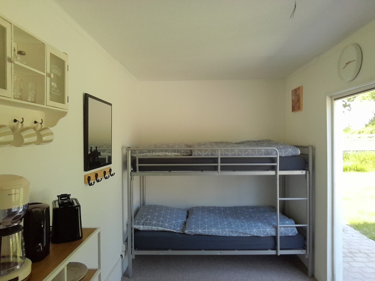 ENJOY SIMPLE LIVING BY THE SEA: (Please note: The rent is cheap and no cleaning fee is charged, so please clean on your departure and bring your own linens, sheets and towels). 22 m2 + Covered panoramic terrace. Views of Ses, Sydals and to Ærø and Germany. Living room with double sofa bed (200*125cm) Alcove with double bed (200*135cm.) Garden with lawn, sea view and garden table. Backyard with lawn. The house is a little low ceilinged in the kitchen.