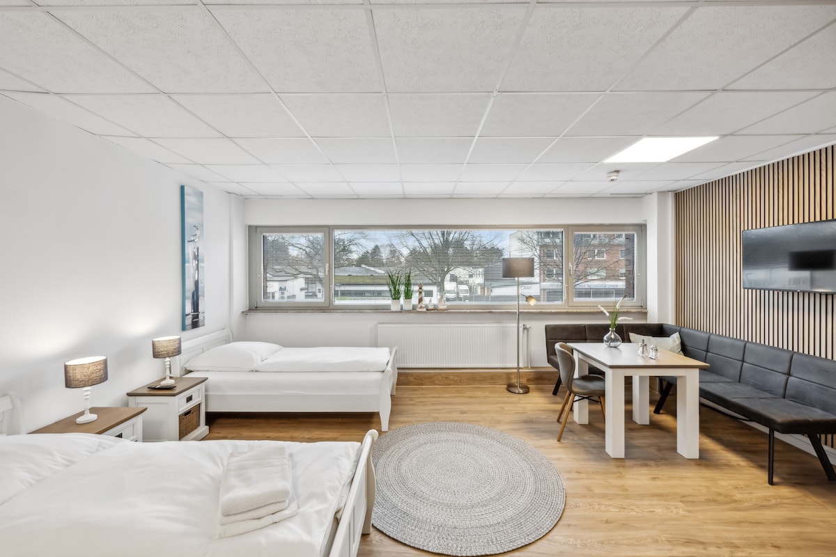 Unsere Apartments dieser Kategorie sind hell und freundlich eingerichtet und bieten Platz für bis zu zwei Personen. Im offenen, großzügig geschnittenen Wohn- und Schlafbereich mit angrenzender Tiny Küche findet ihr ein gemütliches Sofa, einen Flachbild-TV, ein Doppelbett sowie einen Esstisch – perfekt für Lunch & gemütliche Abende. Vom Südbalkon aus habt ihr einen traumhaften und atemberaubenden Blick auf das Meer, die Dünen und den Westturm – während euch die Nordseebrise die Nase kitzelt!