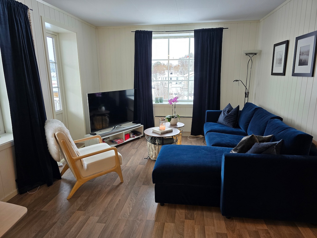 Lys, romslig og pent innredet leilighet med fantastisk utsikt over fjord og fjell. Fra den store terrassen kan du nyte morgenkaffen med utsikt mot vann og mektige fjell. Her har du naturen rett utenfor døra. Ta på deg skoene og gå rett opp i fjellet for flotte turer, eller ta med fiskestanga og gå over veien til brygga for å fiske . Leiligheten passer perfekt for deg som ønsker ro, vakker natur og komfortable omgivelser – enten du vil på fjelltur, fiske eller bare nyte stillheten og utsikten.