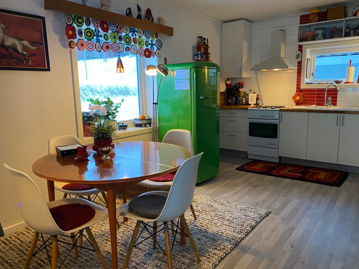 Rural location, 50 m from the sea/pier. Festive, retro style. Well equipped, bathroom with underfloor heating. 2 beds in the loft (steep stairs), 1 sofa bed on the first floor. Bed linen/towels included 45 min drive from Harstad/airport. Minimarket/gas station nearby. Location between Tromsø and Lofoten Rich wildlife in the area, opportunities to see moose, otters, white-tailed eagles, whales, reindeer, etc. Pier can be used, possibility of using kayaks (weather permitting). No smoking/parties