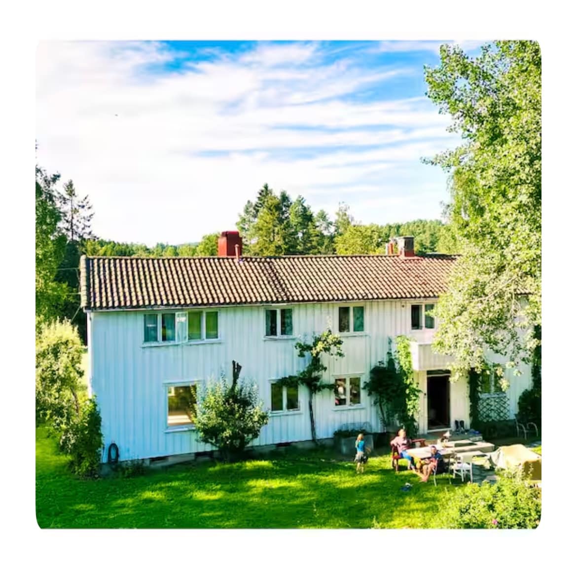 This small social house is situated on the brink of Østmarka national park. You probably will not meet the shy wolf and lynx, but you might see deer og moose. I live here, but sleep in my workshop next door when I have guests. When you are visiting, we share the kitchen and the bathroom, and the big garden. The house is furnished with norwegian design, second hand and hand made book shelves. Book a forest bathing walk if you want 2-3 hours of relaxation. I am a certified forest bathing guide.