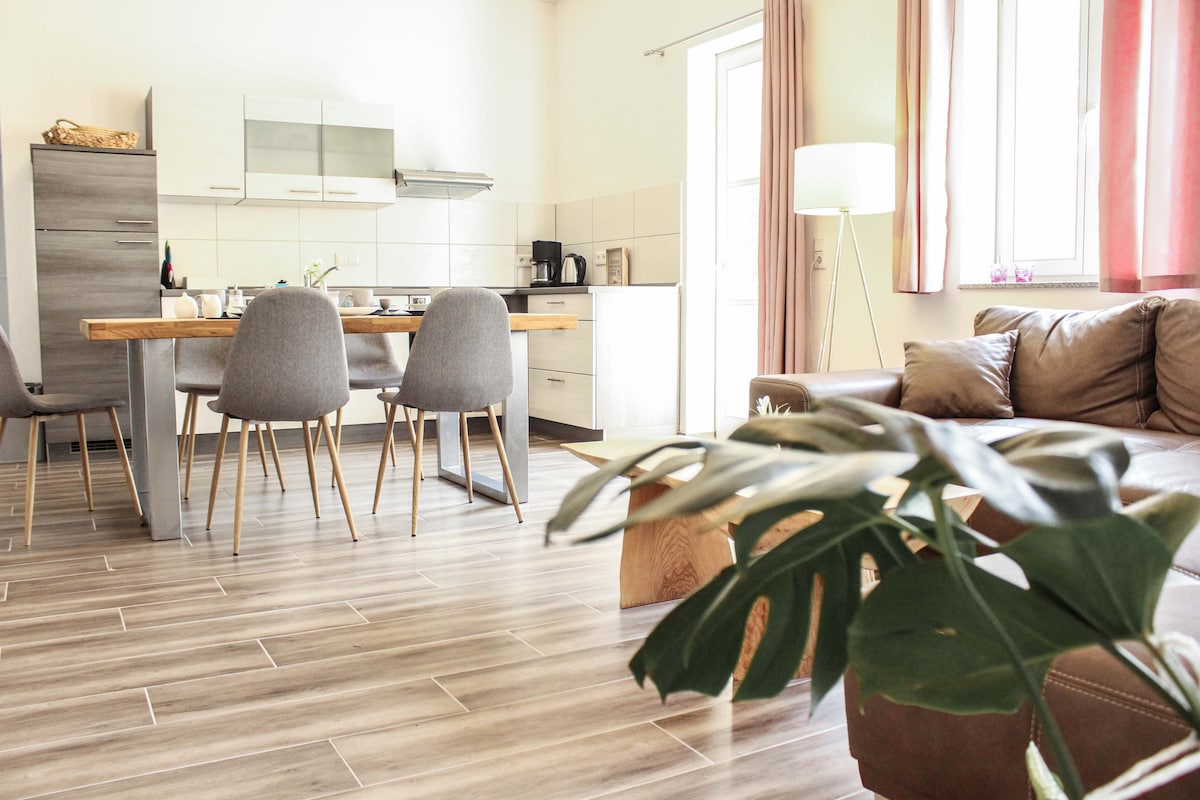Die neu und liebevoll eingerichtete 61 m² Wohnung empfängt Sie im Herzen des Naturparks Saale-Unstrut-Triasland! Natur- und Bewegungsliebhaber können hier Ihre Seele baumeln lassen und Erholung beim Wandern und Radfahren finden. In der wärmeren Jahreszeit lässt sich gut die Weinregion an der Weißen Elster genießen. Egal ob alleinreisende Abenteurer oder Paare (mit und ohne Kinder)- jeder ist in unserem "kleinen Paradies" willkommen! Die hauseigene Infrarotsauna steht Ihnen gerne zur Verfügung!