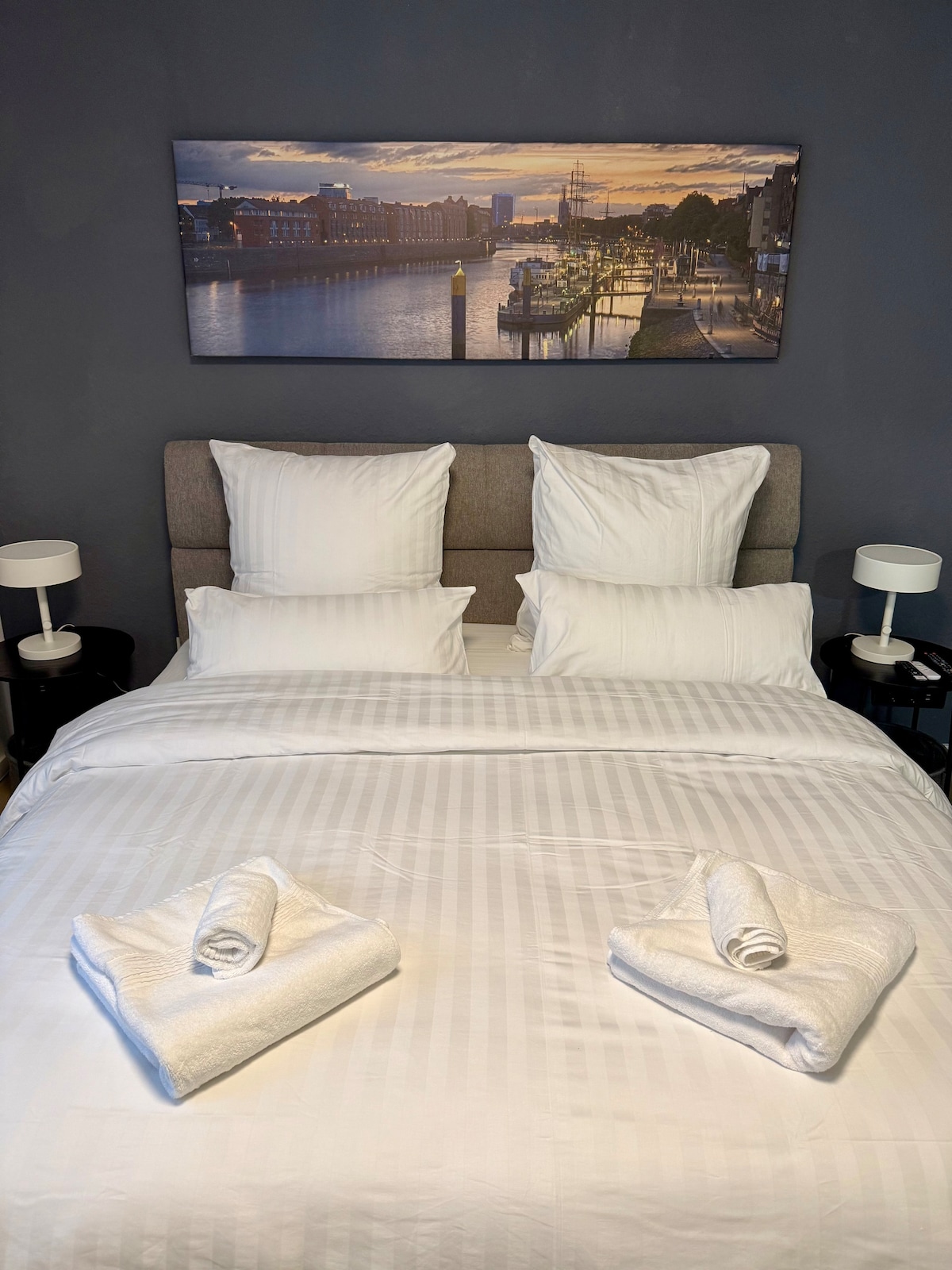 Breathtaking view from the 24th floor with a view over the Outer Weser, the harbor and numerous ships. The glorious sunrises and sunsets make the apartment shine - an absolute dream setting. High-quality, modern furnishings with whirlpool, invigorating rain shower and designer kitchen - a first-class apartment awaits you. Elevator access to the shopping center and underground car park. Highlight on the 25th floor: enjoy the wonderful pool and sauna.