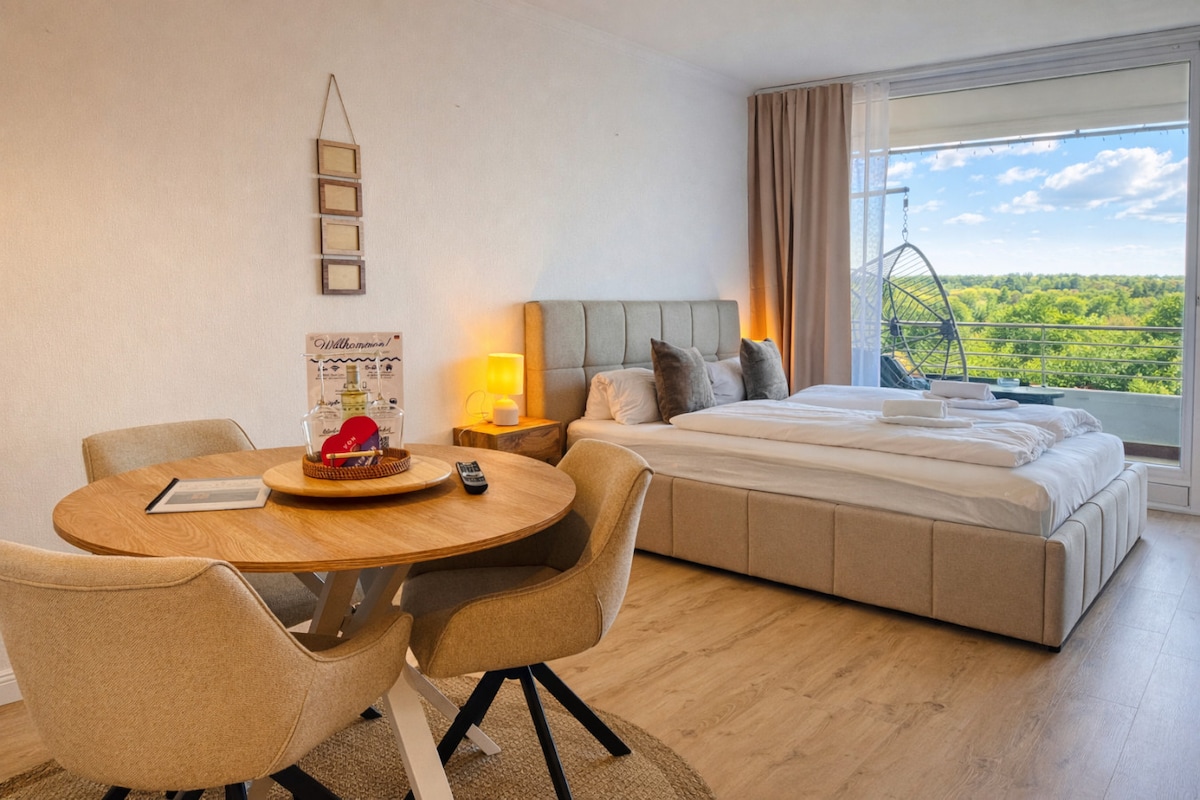 Dieses stilvolle Apartment in der 18. Etage des Plaza Premium bietet einen atemberaubenden Blick über die Felder Ostholsteins und traumhafte Sonnenuntergänge direkt vom Balkon mit Schaukelsessel. Der offene Wohnbereich verfügt über ein besonders bequemes Boxspringbett (180x200 cm), einen Essbereich sowie TV, Spiele und Bücher für entspannte Abende. Zusätzlich gibt es einen kleinen separaten Schlafraum, ideal für Familien oder Gäste, die etwas mehr Privatsphäre möchten. Die voll ausgestattete Küche (inkl. zwei Kaffeemaschinen) eignet sich perfekt für ein gemütliches Frühstück oder ein Abendessen im Apartment. Das Badezimmer verfügt über Badewanne, Regendusche und Bidet. WLAN, Bettwäsche und Handtücher sind selbstverständlich inklusive. Auf Wunsch können Gäste gegen Gebühr auch Frühstück sowie den Wellness- und Sportbereich des Hotels nutzen.