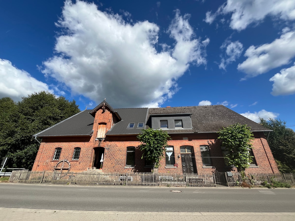 Loft in alter Wassermühle mit Sauna, Beamer, wildem Garten und eiskaltem Bach. Zwei Etagen voller Charme, Geschichte und entspanntem Chaos. 3 Betten (140x200 cm), große Küche, offenes Wohnen – perfekt für Freundesgruppen, Familien oder kreative Rückzüge. Kein Skandi-Schnickschnack, sondern Edelpunk zwischen Enten, Hängematte und Feuerstelle.