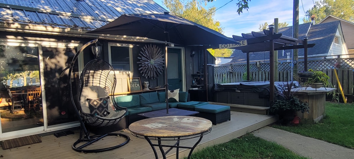 Relax & kick back in this cozy, stylish cottage in the heart of Port Dover! -Pet friendly! -Hot tub all year! -Fully Fenced in -Short walk to the beach -2 Bicycles incl. -Cornhole & Putting Green -Fireplace -AC -Fast Wi-Fi -Lg. yard -Rainshower -Solo Stove/Wood Bonfire -Gas BBQ -Deck & lounge chairs -Nearby restaurants, cafés, shops -Blackout blinds This cottage is located on the same property as the Ivory Cottage, if you want to have friends/family stay close by they can book it!