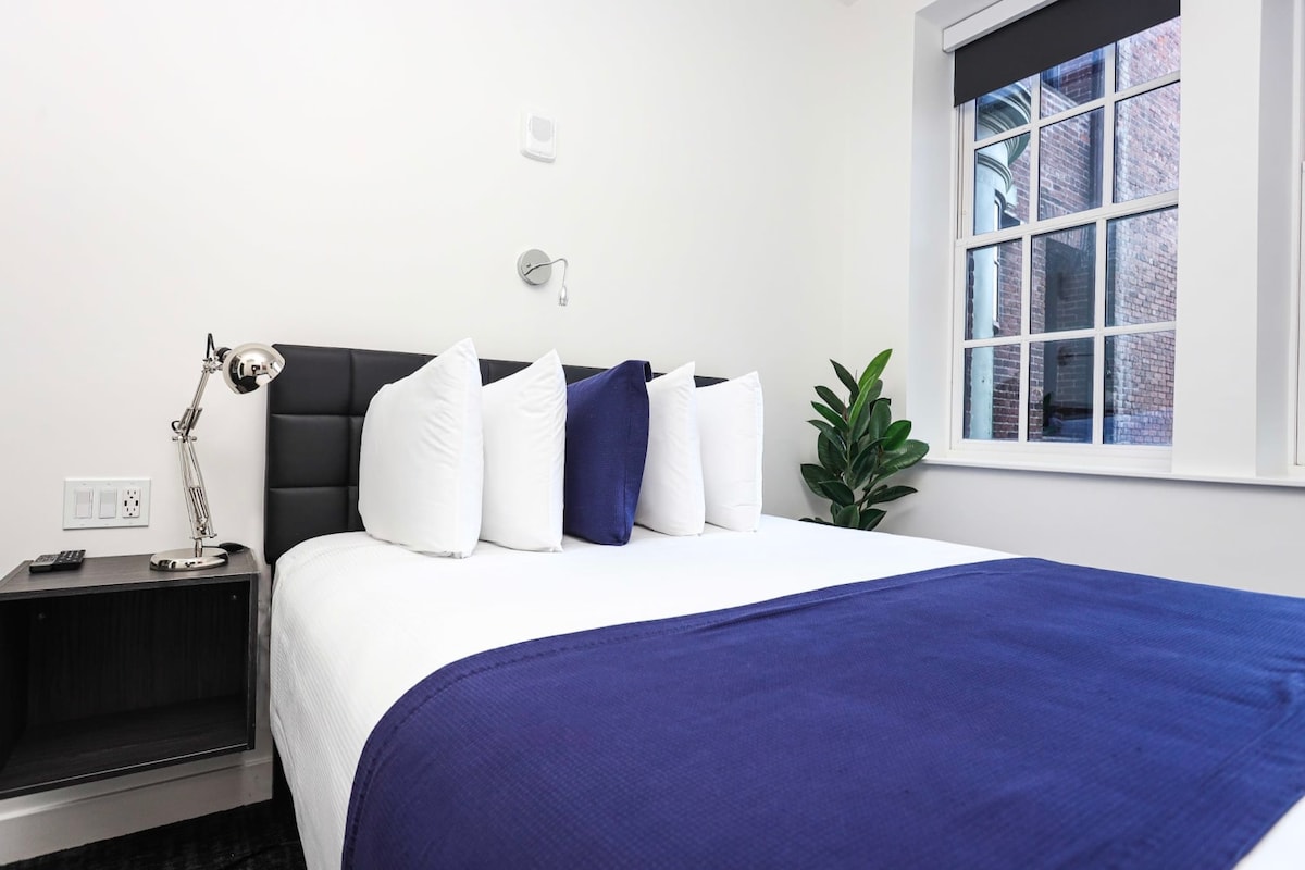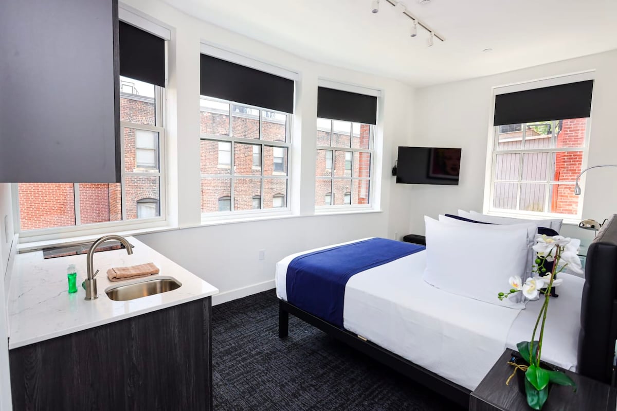 Experience a unique, comfortable and luxurious stay in Boston at Maverick Suites' 28 Fenway. Located in the heart of the Fenway District, this modern studio apartment provides luxury and style with a hint of rebellion. This room is located in the former great room of a hundred year old mansion. Enjoy the convenience of being close to the city's best restaurants, museums, and attractions. With comfortable furnishings, stylish decor, and a spirit of exploration, Maverick Suites' 28 Fenway is the p