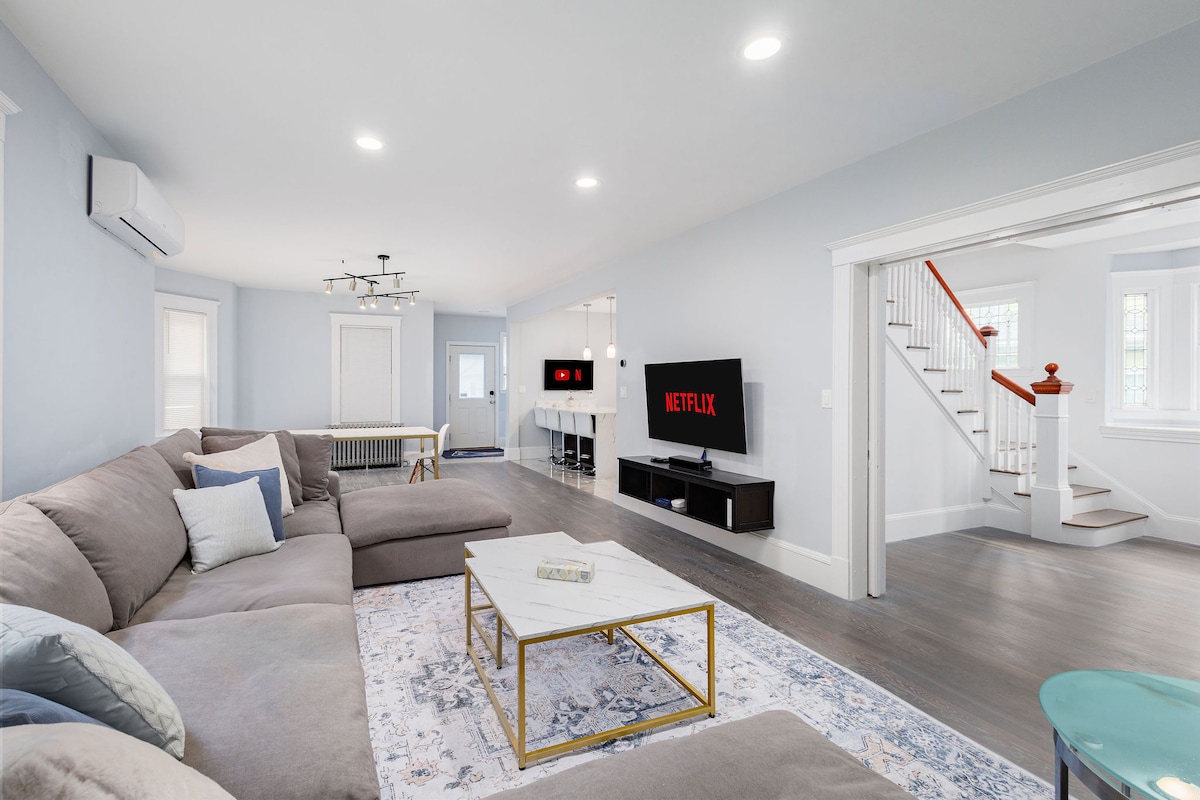 We call this the Senator for its classic architecture, It welcomes you with generous living space! Updated kitchen and dining area made for gatherings. Snuggle up on the spacious couch for conversation or some movies and shows. Retreat into the cozy bedrooms to relax and recharge for your days ahead. We are conveniently within walking distance to the MBTA train station, easy access to Boston and many other interesting locations. Parking for 3 vehicles, Tesla Charger, and many cuisines nearby.