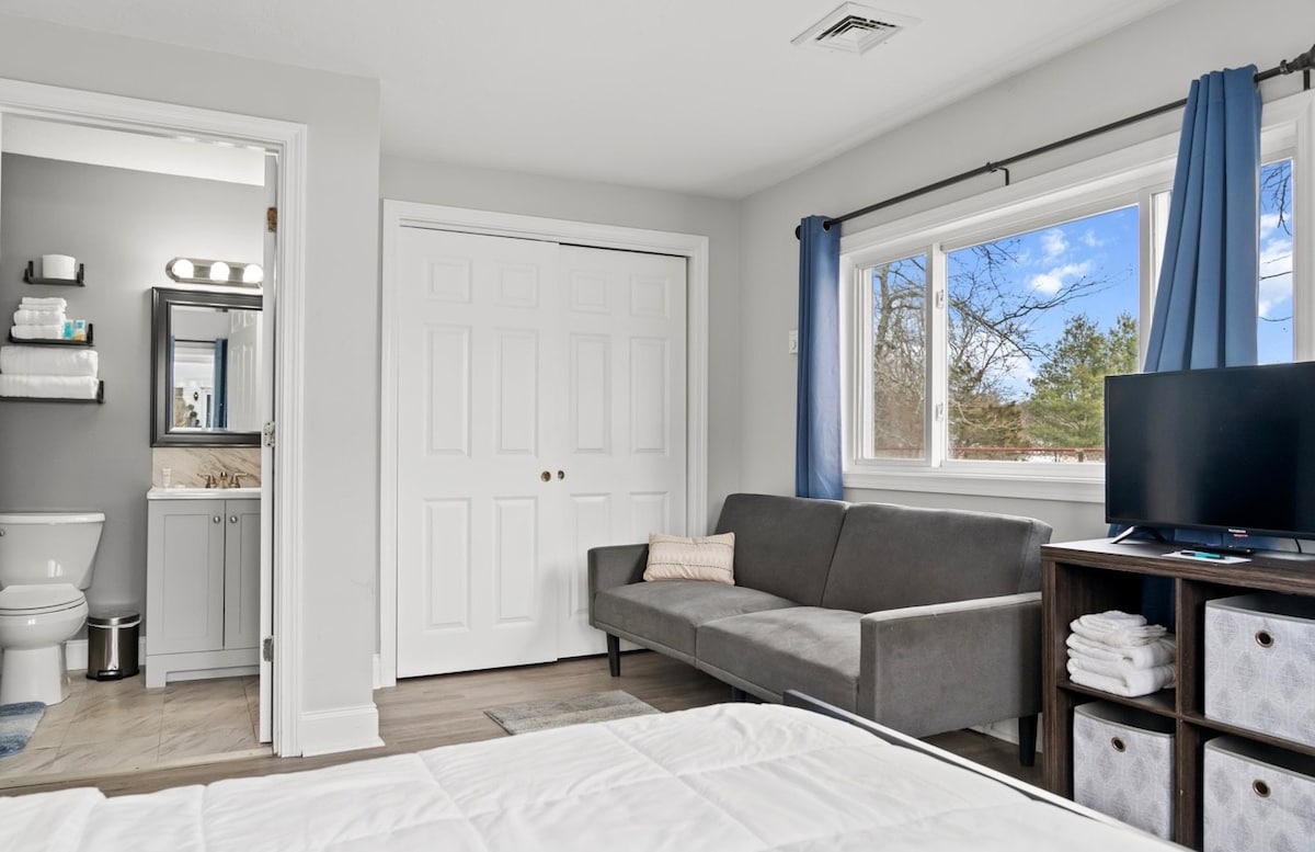 Welcome to your perfect getaway! This deluxe studio suite offers hotel-style comfort with all the essentials you need for a relaxing stay. Enjoy a cozy full XL bed, a comfy couch for lounging, and a private bathroom stocked with fresh towels. There’s also a mini fridge for your snacks and drinks, and a coffee machine to start your mornings right. Whether you're in town for work or play, this bright and welcoming space is the ideal home base.