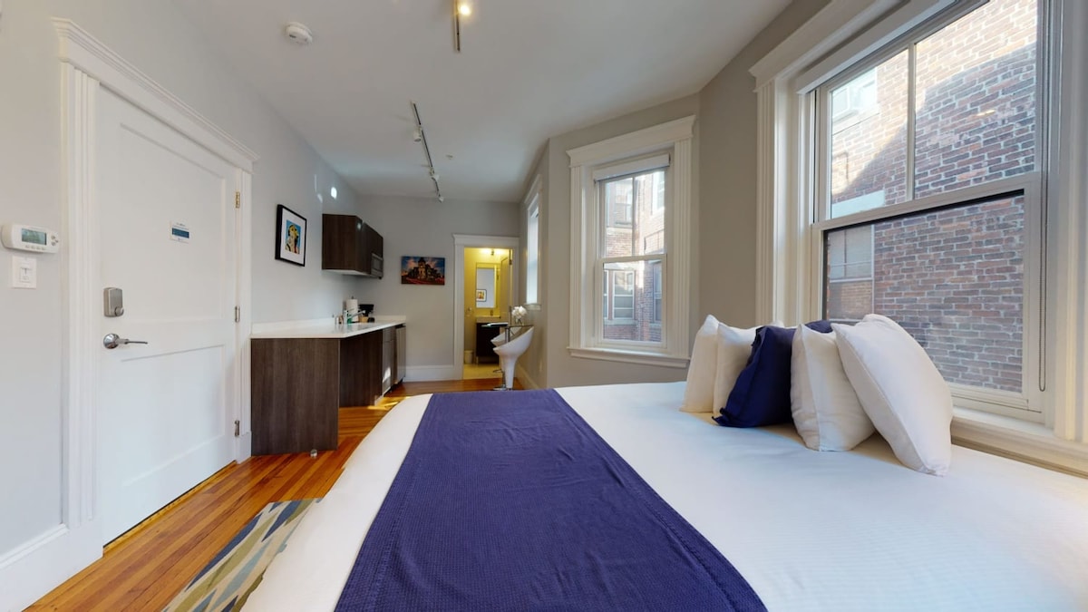 ✨BRAND NEW✨ 1 King-Bed Luxury Studio with private upgraded bathroom & fully-stocked kitchen, located right at Boston Commons and Downtown! NO SHARING OF RESTROOMS OR KITCHEN! 📍 Centrally located to be able to walk anywhere needed and 200-400 ft. to multiple T stops 🚊. Perfect for traveling professionals, mid-term stays and more! ALL UTILITIES INCLUDED. 452 sq. feet. 8th floor. Elevator access, no stairs.