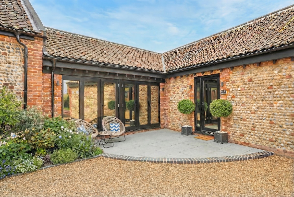 A spacious barn conversion in the heart of the Norfolk Broads. Oak Barn Norfolk is a sympathetically, newly converted, barn in the village of Tunstead. It offers 4 large bedrooms, a beautiful double vaulted kitchen/dining room, a spacious living room with a cosy wood burner, a snug, 3 bathrooms and a W/C. The floors are natural limestone with underfloor heating throughout. Oak Barn has two outdoor seating areas, a sunny court yard and a fully enclosed lawned garden.
