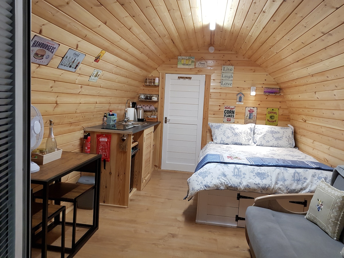 'Charlotte-Rose' is our handcrafted, luxurious Shepherd's hut. Designed and made to provide all you need for your comfort and pleasure. The Shepherd's hut comprises of a double bed, seating area, kitchenette and self-contained shower room. You will be provided with a continental breakfast including croissants, juices and home made jams, coffee, teas, sugar & milk A private hot tub is available for an additional charge, along with use of a BBQ, local produce for a full English, fizz on ice etc