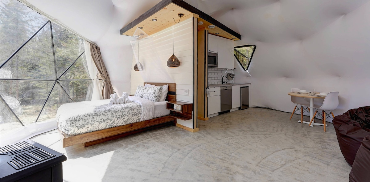 Visit our Airbnb profile to discover our 6 private domes! : ) Welcome to Domaine l'Évasion! Enjoy a romantic getaway under a starry sky. Relax in your private 4-season spa, nestled in the heart of a coniferous forest, lulled by birdsong. ★ 25 minutes to Tremblant ★ Private 4-season spa ★ Indoor Gas Fireplace ★ Fire pit ★ Picnic area with BBQ ★ Hiking trail ★ Private shower ★ Full kitchen ★ AC
