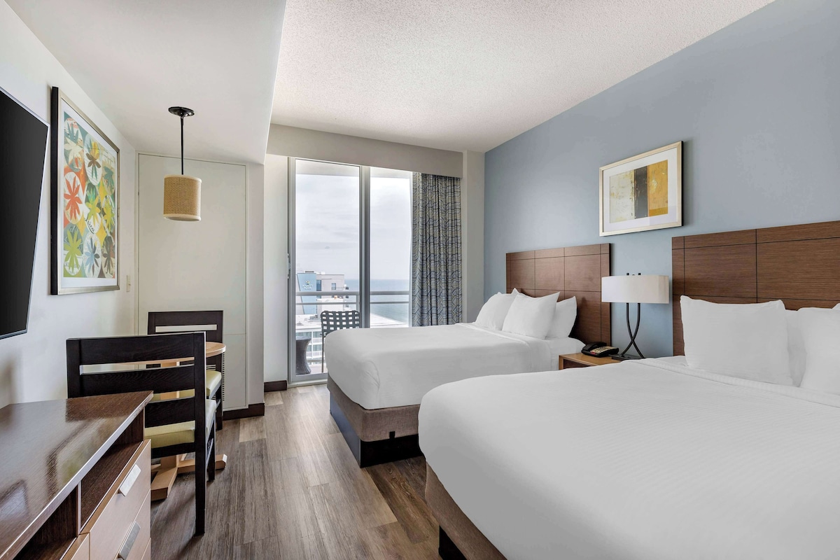 This resort offers upscale suites & an array of amenities! Just steps from the sand in Virginia Beach, unwind at one of the oceanfront pools, enjoy a specialty cocktail at the lounge or dine poolside for breakfast, lunch or dinner. Other resort amenities include a sundeck overlooking the ocean, fitness center, game room & daily planned activities.