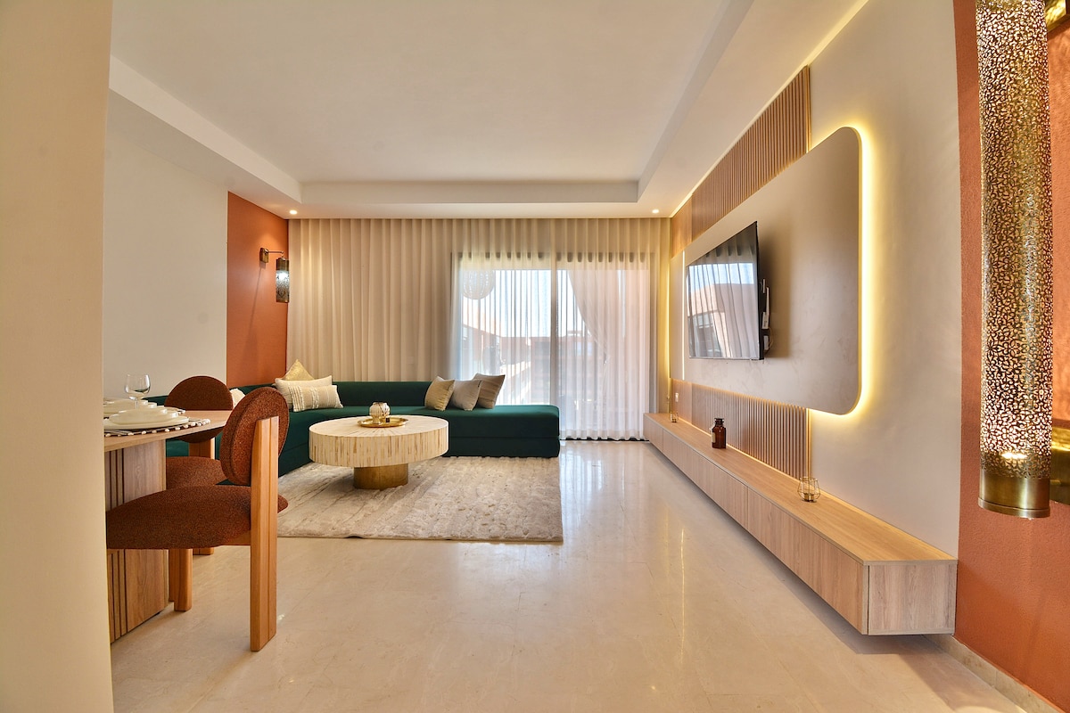 Séjournez en plein cœur de Marrakech dans notre appartement 2 chambres et 2 salles de bain. Profitez d'une literie Simmons haut de gamme, WiFi haut débit (fibre optique) et d'une décoration moderne avec une touche ethnique. Cuisine entièrement équipée, baignoire élégante, et douche italienne. À quelques pas de la place Jemaa el-Fna, du Plazza, et du Carré Eden. NB : Les couples marocains non mariés ne sont pas autorisés.