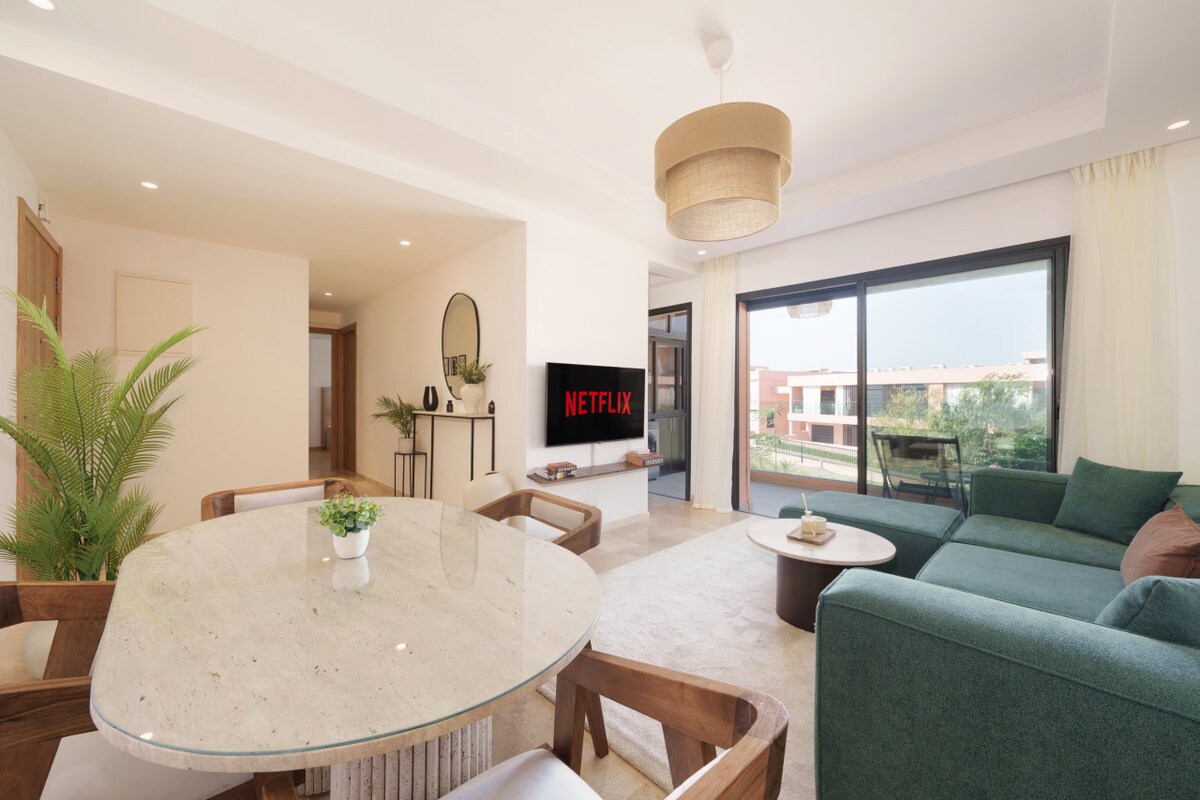 Bright luxurious appartment, and wonderful place to be for holidays, with it private garden at the most unique and central golf resort Prestigia in Marrakech. Located at only 5 minutes drive from Marrakech Menara airport and at 5 minutes drive from Gueliz city center and Médina Souks. At Prestigia resorts you will find peace, calm and for sure security as well as promixity to all distractions that you will absolutely need, as for shopping and entertainment (golf, clubs, restaurants, cinema…)
