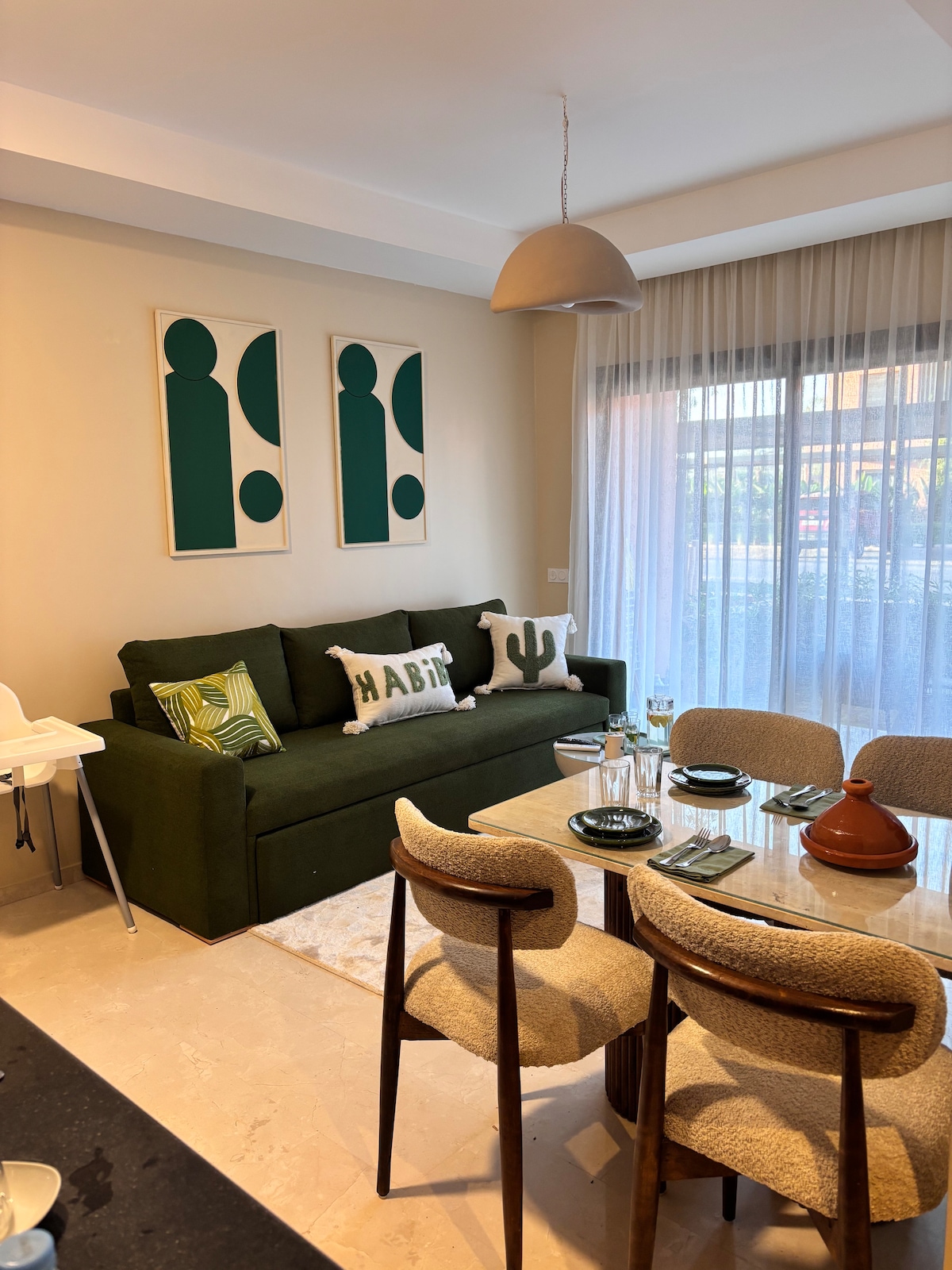 Bienvenue dans cet appartement moderne, lumineux et parfaitement équipé, situé au cœur de la résidence Golf Noria, l'une des résidences les plus recherchées de Marrakech pour son calme, sa sécurité et son cadre verdoyant 🌿 Situé à seulement 12 minutes de Gueliz et à proximité de l'aéroport (moins de 10minutes), ce logement offre un parfait équilibre entre confort, tranquillité et standing. Idéal pour un séjour en couple, entre amis ou en famille!